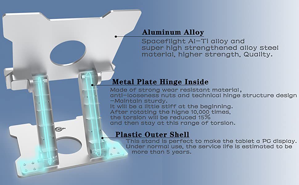 Please Note : The two supports of stand are made of metal plate hinge inside with plastic outer shell, the rest of them are aluminium. For solid support, it may be a little hard to adjust the angle ?Excellent stability). Under different lighting conditions, the product will have a certain color difference.