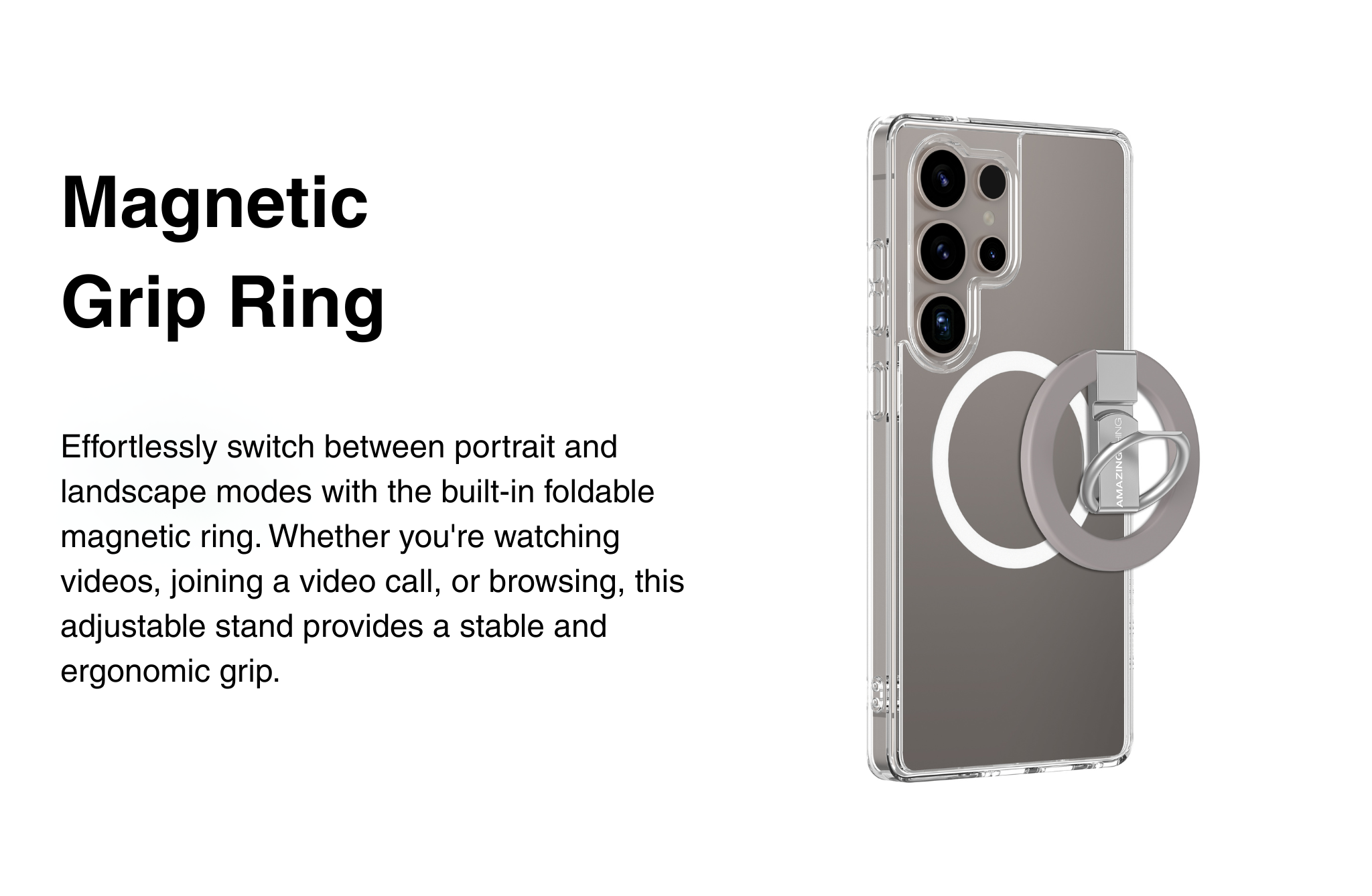 Magnetic Grip Ring - Secure Hold & Hands-Free Viewing: Effortlessly switch between portrait and landscape modes with the built-in foldable magnetic ring. Whether you're watching videos, joining a video call, or browsing, this adjustable stand provides a stable and ergonomic grip. Its AI-driven ergoFrame design ensures a secure hold, reducing the risk of accidental drops.