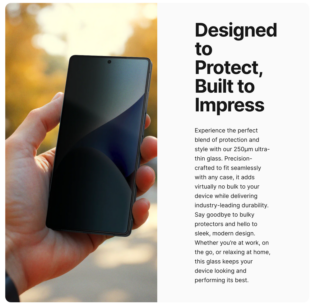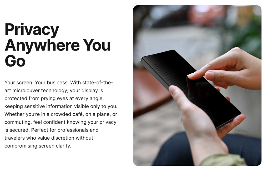 Privacy version - for on-the-go screen confidentiality: Featuring advanced micro-louver privacy filtering, the Privacy version keeps your information safe from side-angle views while maintaining clear, vibrant visuals when viewed straight-on. Whether you're commuting, working in public, or just value your privacy, this option ensures your screen is only yours to see - without sacrificing protection or touch sensitivity.