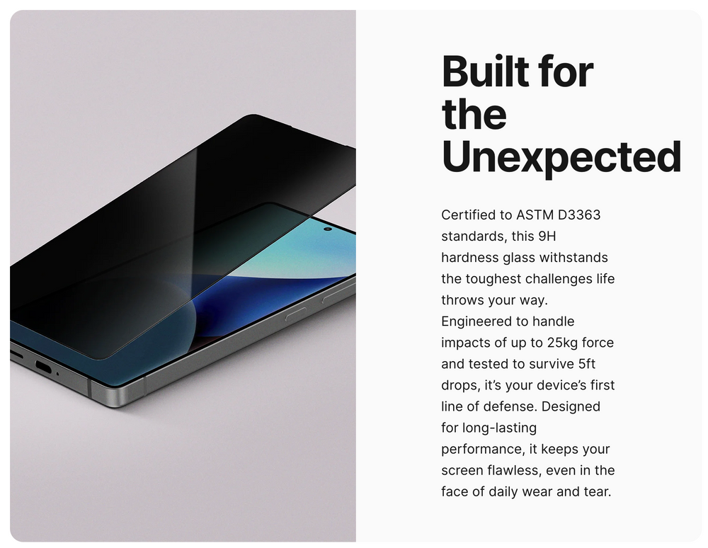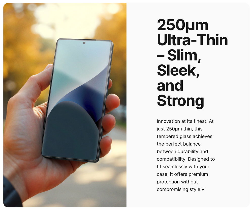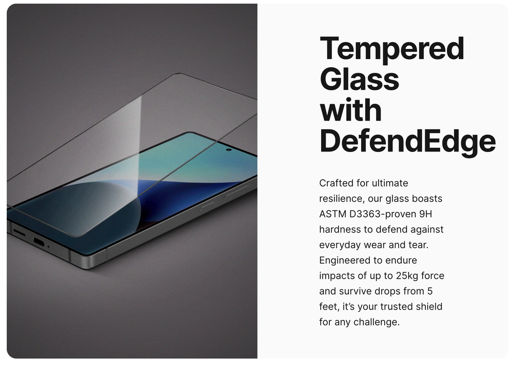 DefendEdge tempered glass with 9H hardness: B At just 250 microns thin, the Radix Galaxy S25/ S25+/ S25 Ultra tempered glass screen guard delivers a barely-there feel while maintaining the structural strength to handle daily hazards. It integrates perfectly with most cases, offering full-screen coverage without interfering with edge protection or usability.