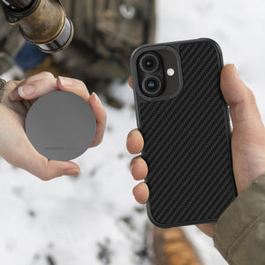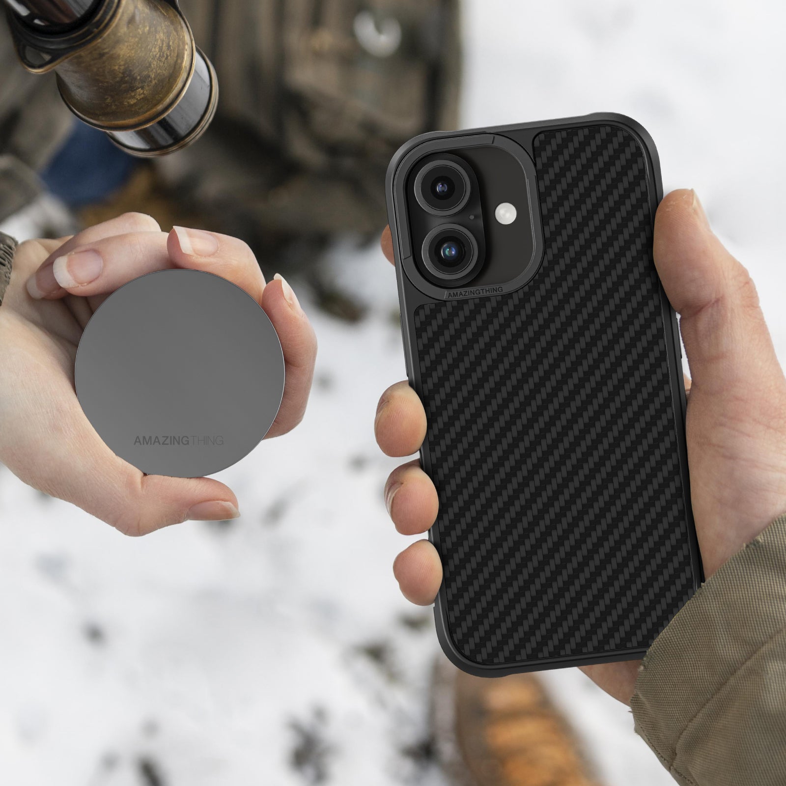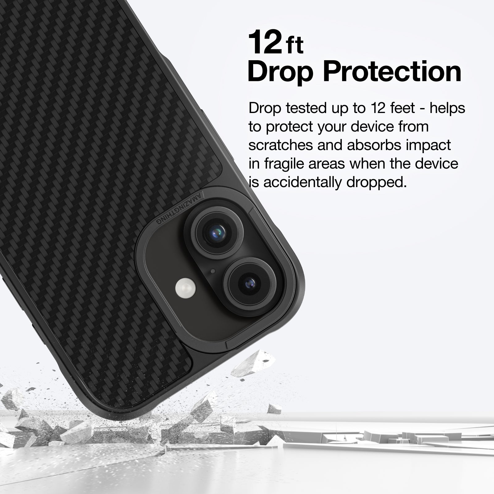🛡️ Premium Aramid Fiber – Bulletproof-Grade Protection: Forged from 1500D aramid fiber, a material five times stronger and thinner than steel, the backplate offers bulletproof-level durability while maintaining a featherlight profile. Resistant to UV rays, chemicals, and daily wear, this military-grade material keeps your iPhone 16/16 Plus secure from even the harshest elements. The carbon fiber texture enhances grip and adds a luxurious touch—perfect for professionals, adventurers, and minimalists alike.
