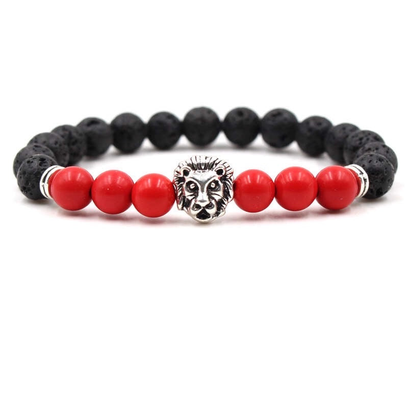 Argent Craft Natural Lava Stone & Red Coral Bracelet with Lion Head(Silver)