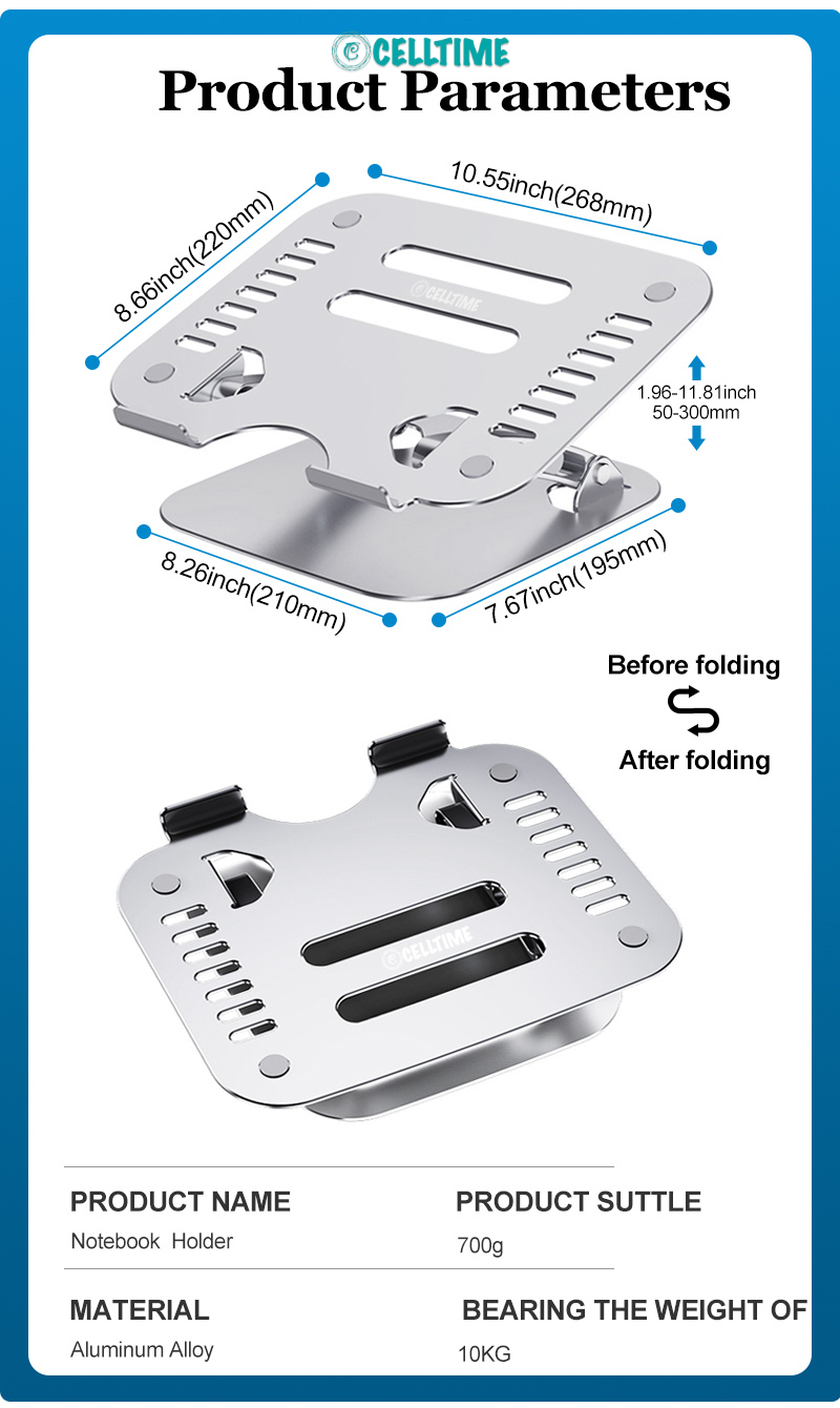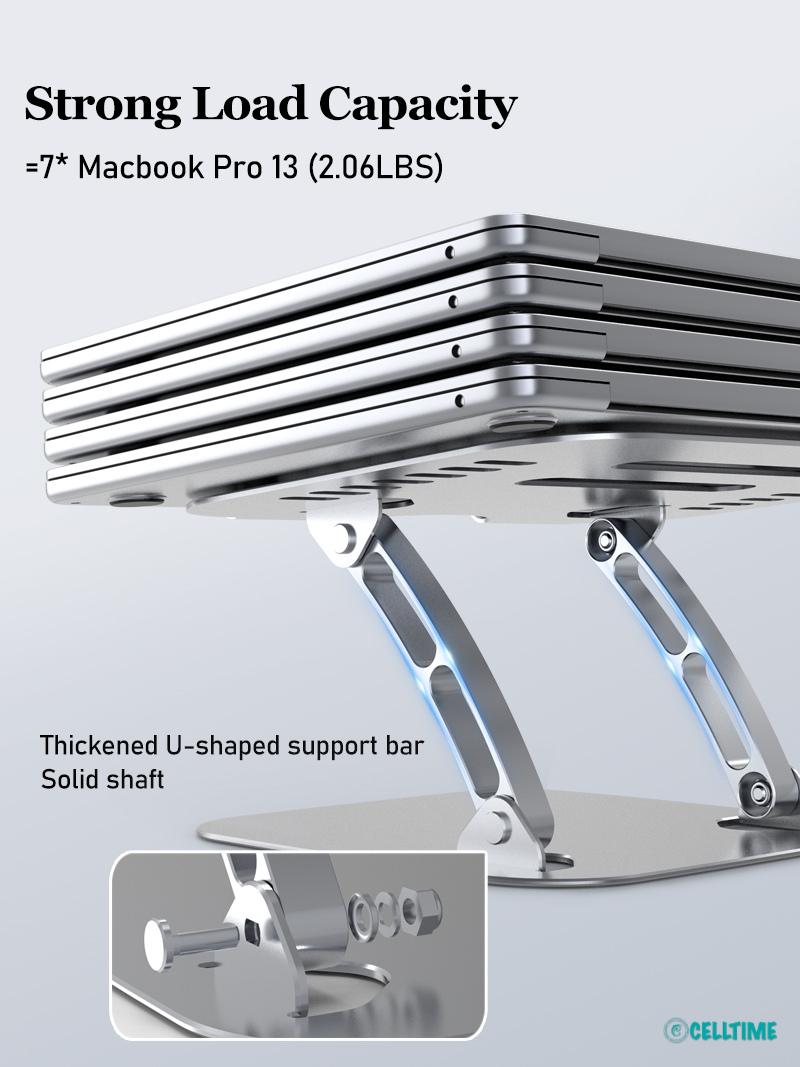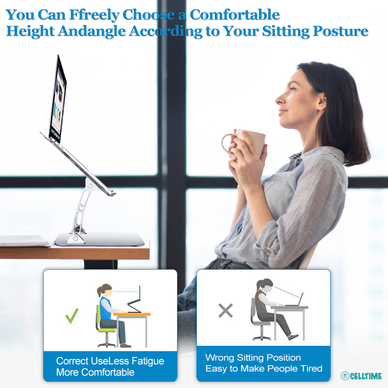 Ergonomic Design: the CellTime™ Ergonomic Height Angle Adjustable Cool Portable Laptop Stand can elevate notebooks or laptops, so you can stand up to work or raise the eye level, getting better posture to release the pain or stress. Dual adjustable shafts provide ideal view while using your laptop.