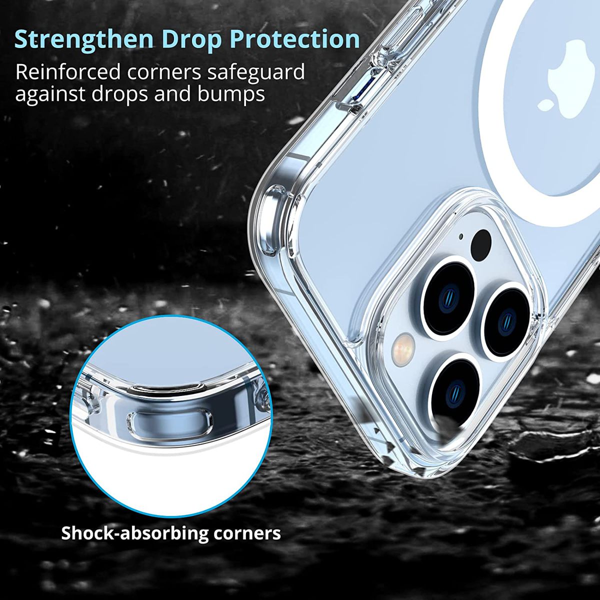 The CellTime™ iPhone 13 Pro Clear Shockproof Clear Cover with MagSafe is thin, light, Shockproof and easy to grip, this CellTime designed case shows off the brilliant colored finish of iPhone 13 Pro while providing extra protection. Crafted with a blend of optically clear acrylic and flexible materials, the case fits right over the buttons for easy use. And all materials and coatings are optimized to prevent yellowing over time.