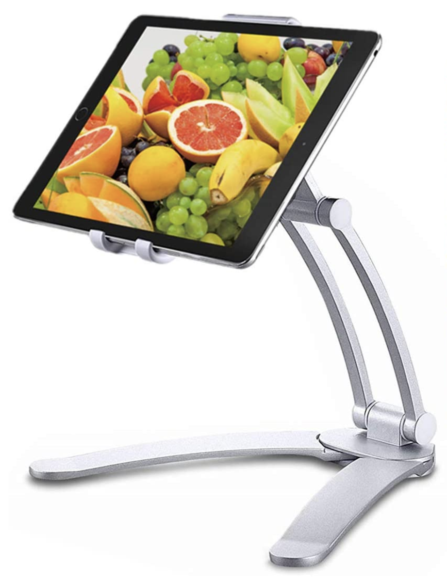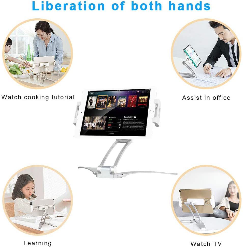 New structure design, More stable - The lazy tablet holder adopts an adjustable A-shaped structure design, which greatly improves the stability of the bracket. You can also fold kitchen tablet holder and insert it into the base to hang it. local. The lazy wall holder arm has a 3-section design that allows easy adjustment of different angles. The clip also supports 360° rotation adjustment to meet your different viewing angle needs