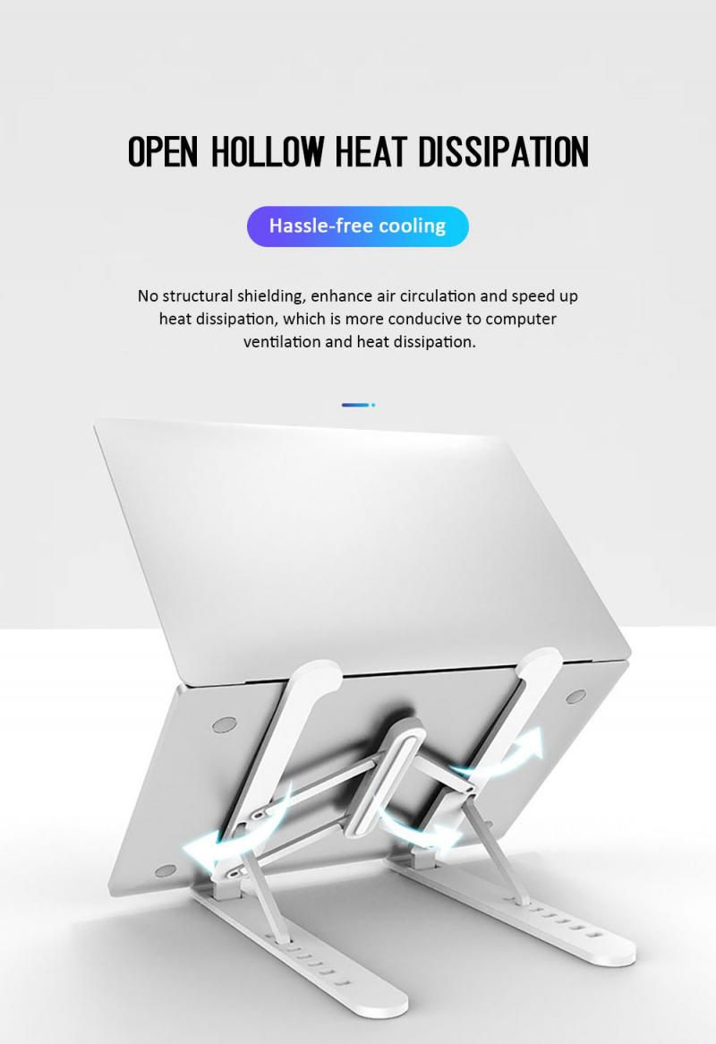 Heat dissipation : the laptop support has no base plate, which can be easily cooled. The front inclined open design provides ventilation and air flow to prevent the laptop from overheating.