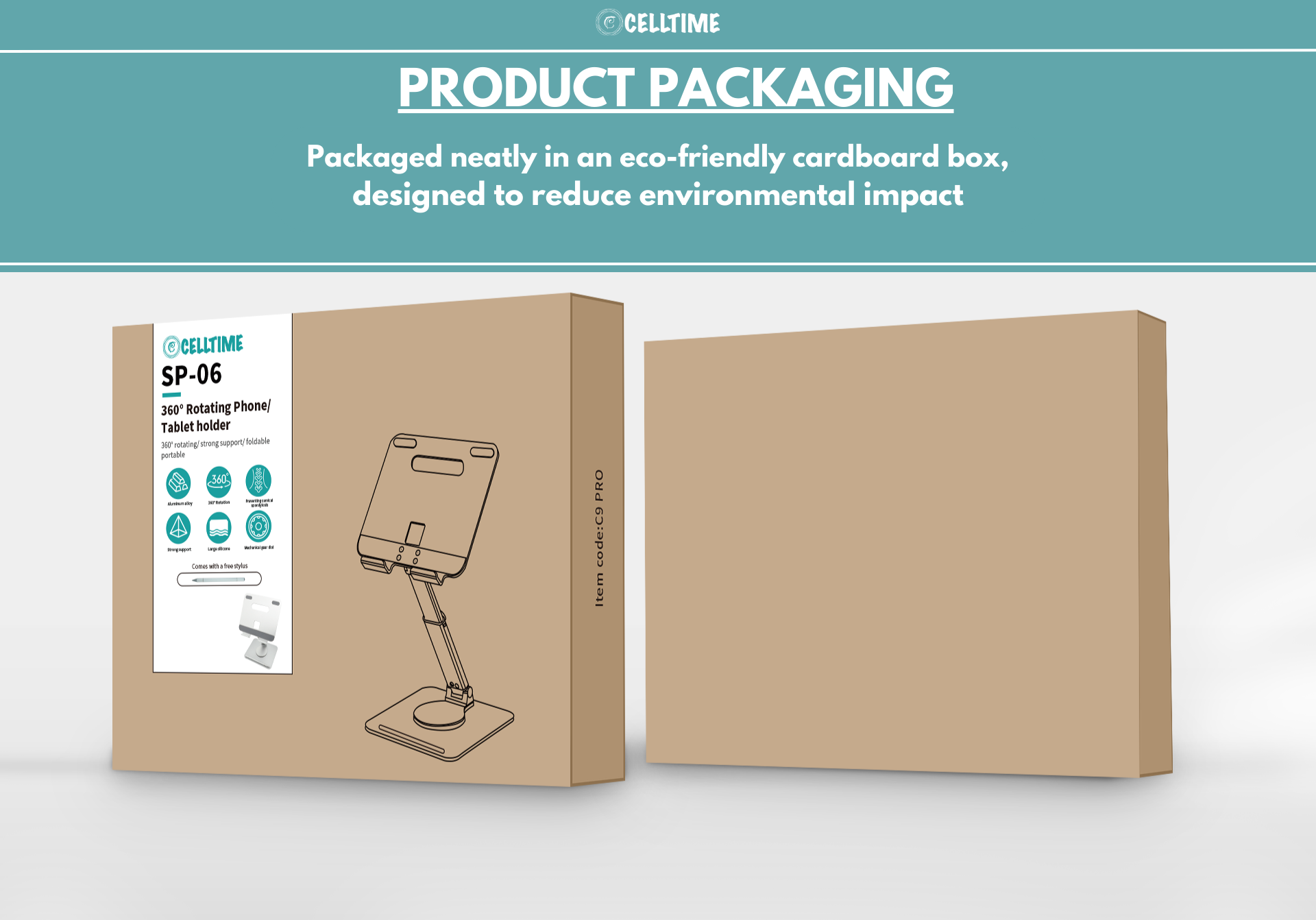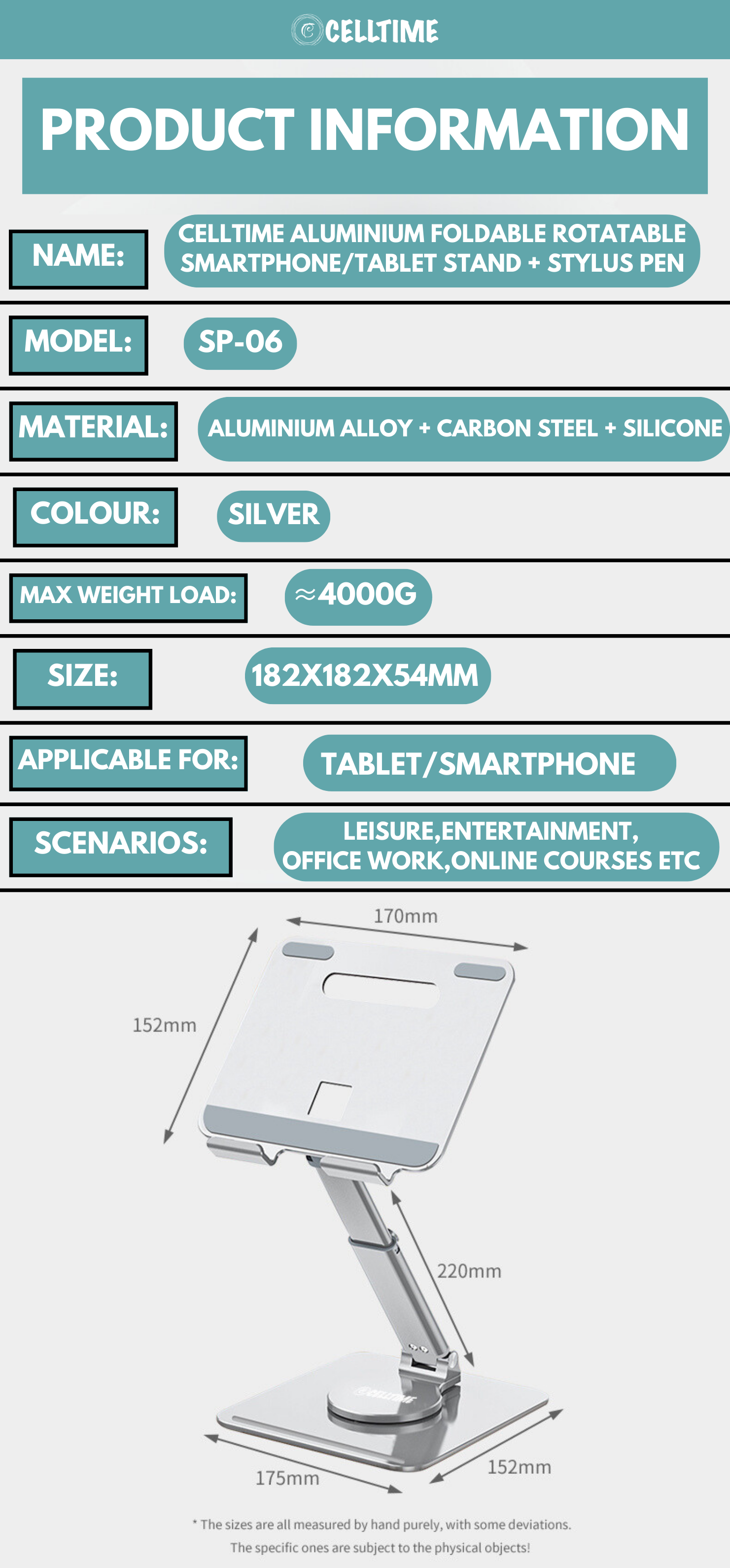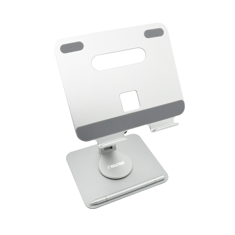 he CellTime Aluminium Foldable Rotatable Tablet Stand with Stylus Pen (Model: SP-06) combines functionality, durability, and convenience in one sleek design. Whether you're working, gaming, or creating, this stand delivers unmatched stability, flexibility, and practicality for your devices.