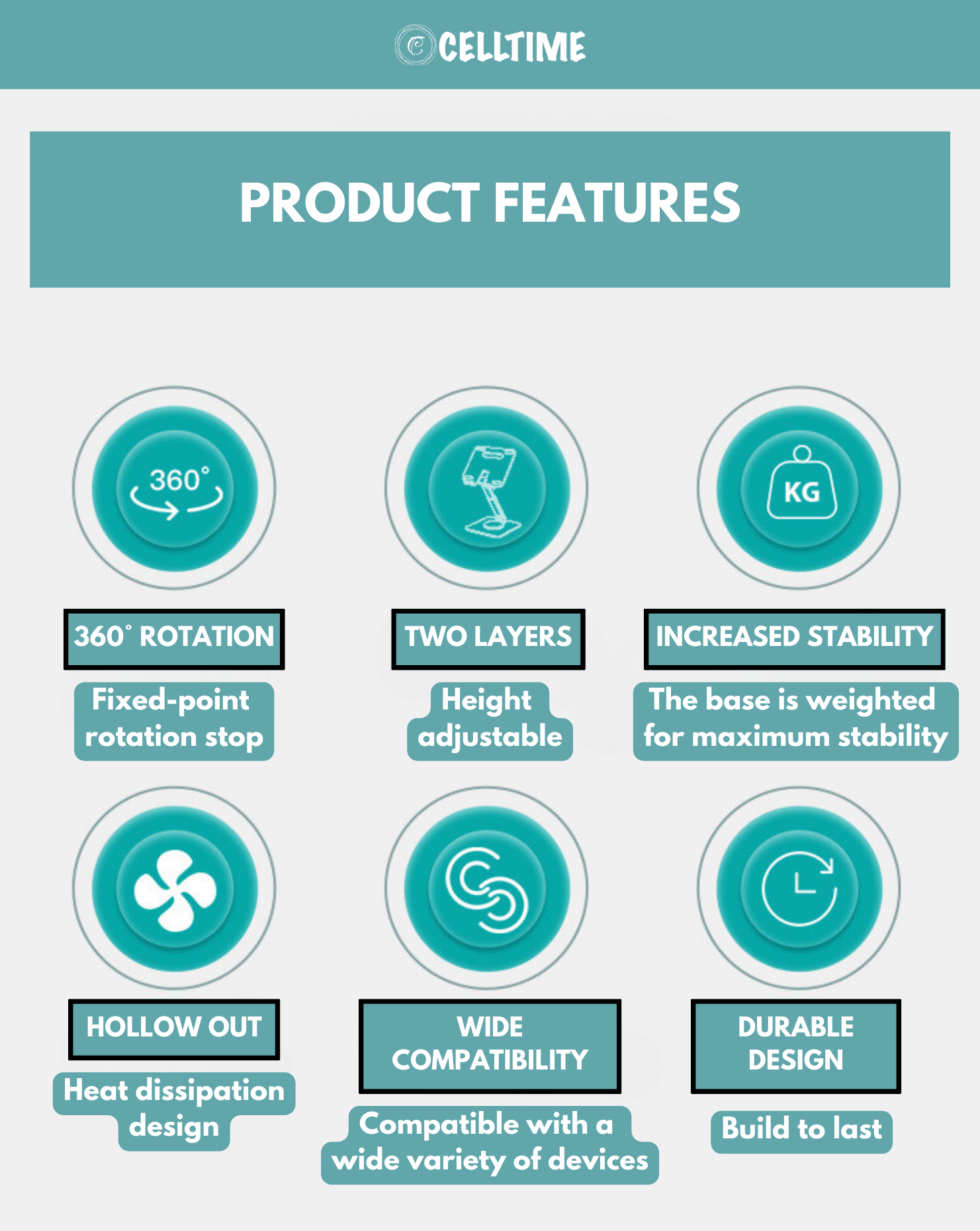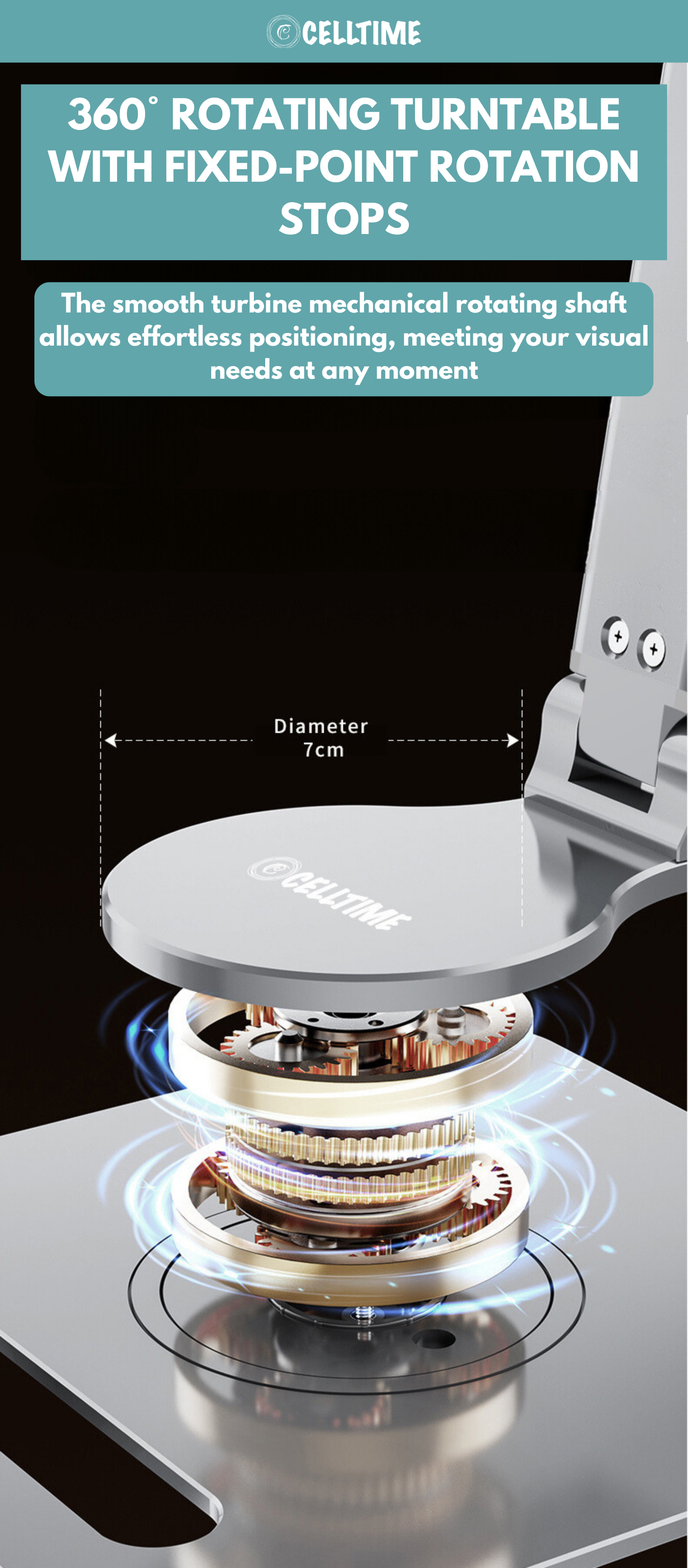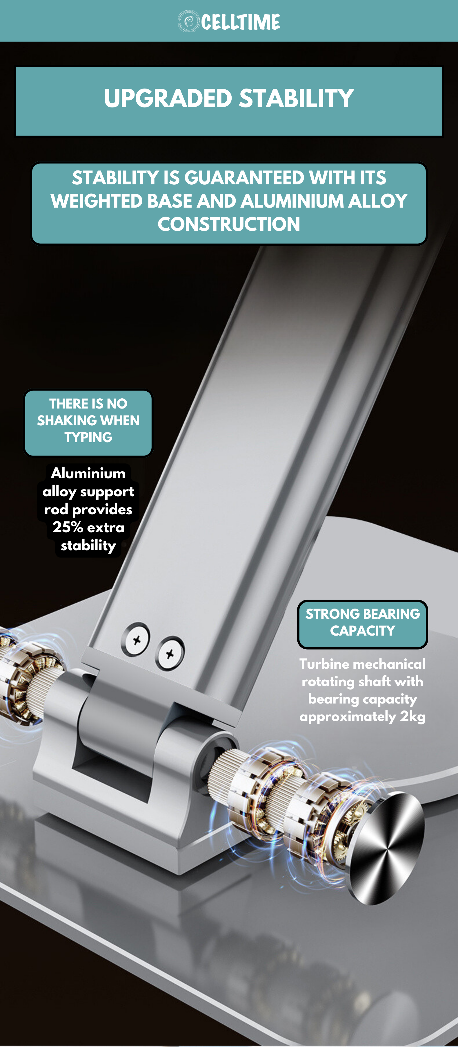 Stable, Durable, and Built to Last: Stability is guaranteed with its weighted base, measuring 7cm in diameter, and aluminium alloy construction, increasing overall stability by 25%. Supporting a remarkable load of up to 4kg, the stand accommodates smartphones, tablets, and other devices with ease. The turbine mechanical shaft enhances durability, ensuring smooth performance over time without compromising strength.