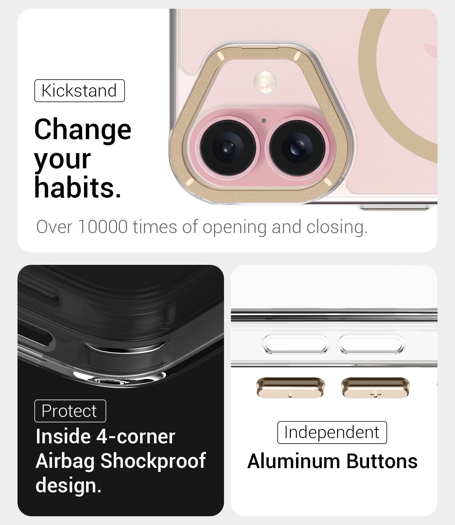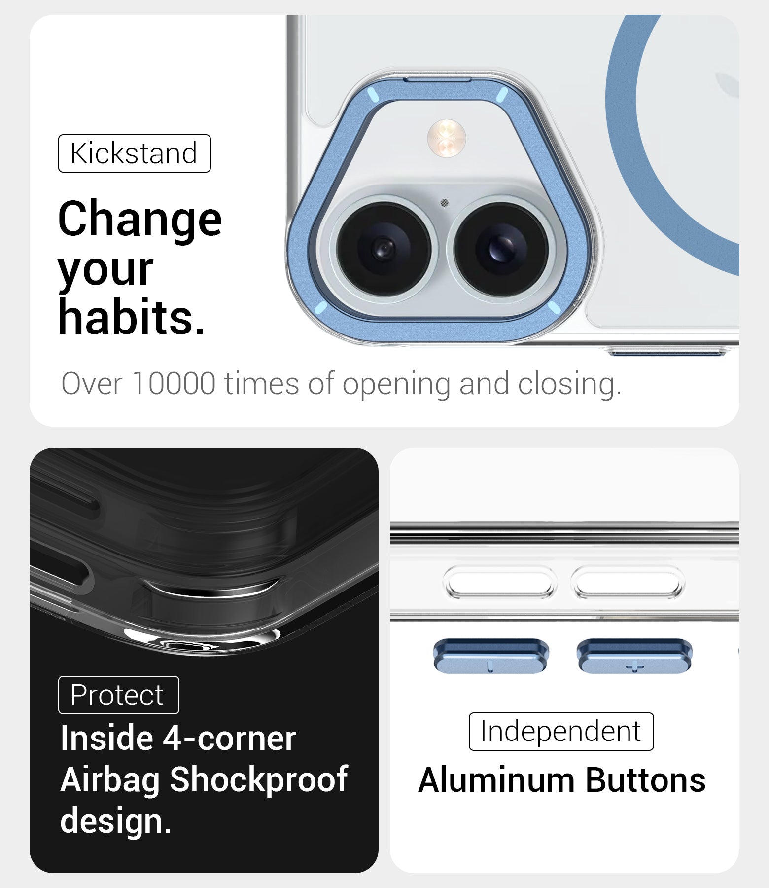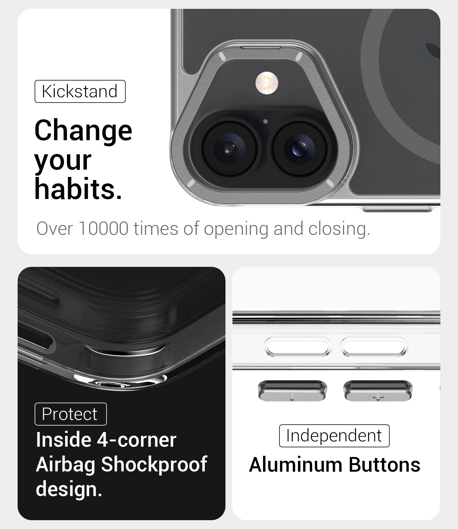Aluminum Camera Frame with Kickstand: The integrated aluminum camera frame not only safeguards your camera but also features a durable kickstand made from zinc alloy. With a 90-degree opening, this kickstand is perfect for watching videos or performing focused tasks. Tested for durability, it offers over 10,000 cycles of opening and closing, ensuring long-lasting performance.