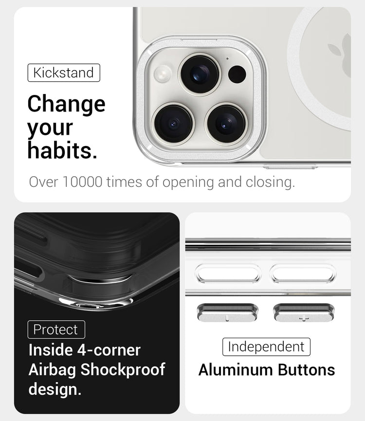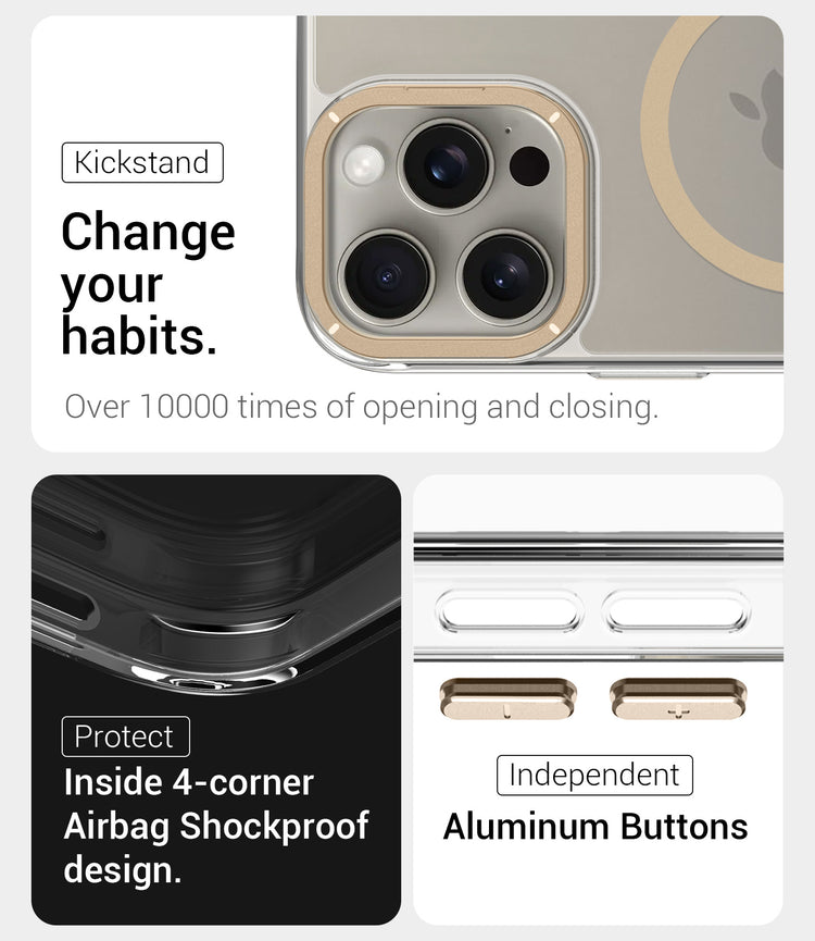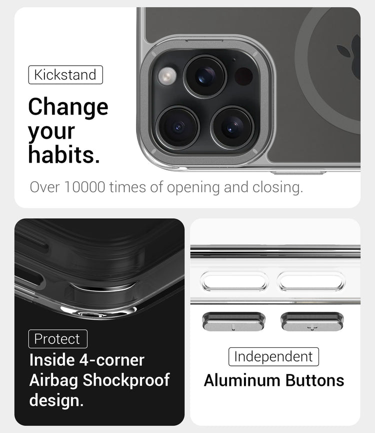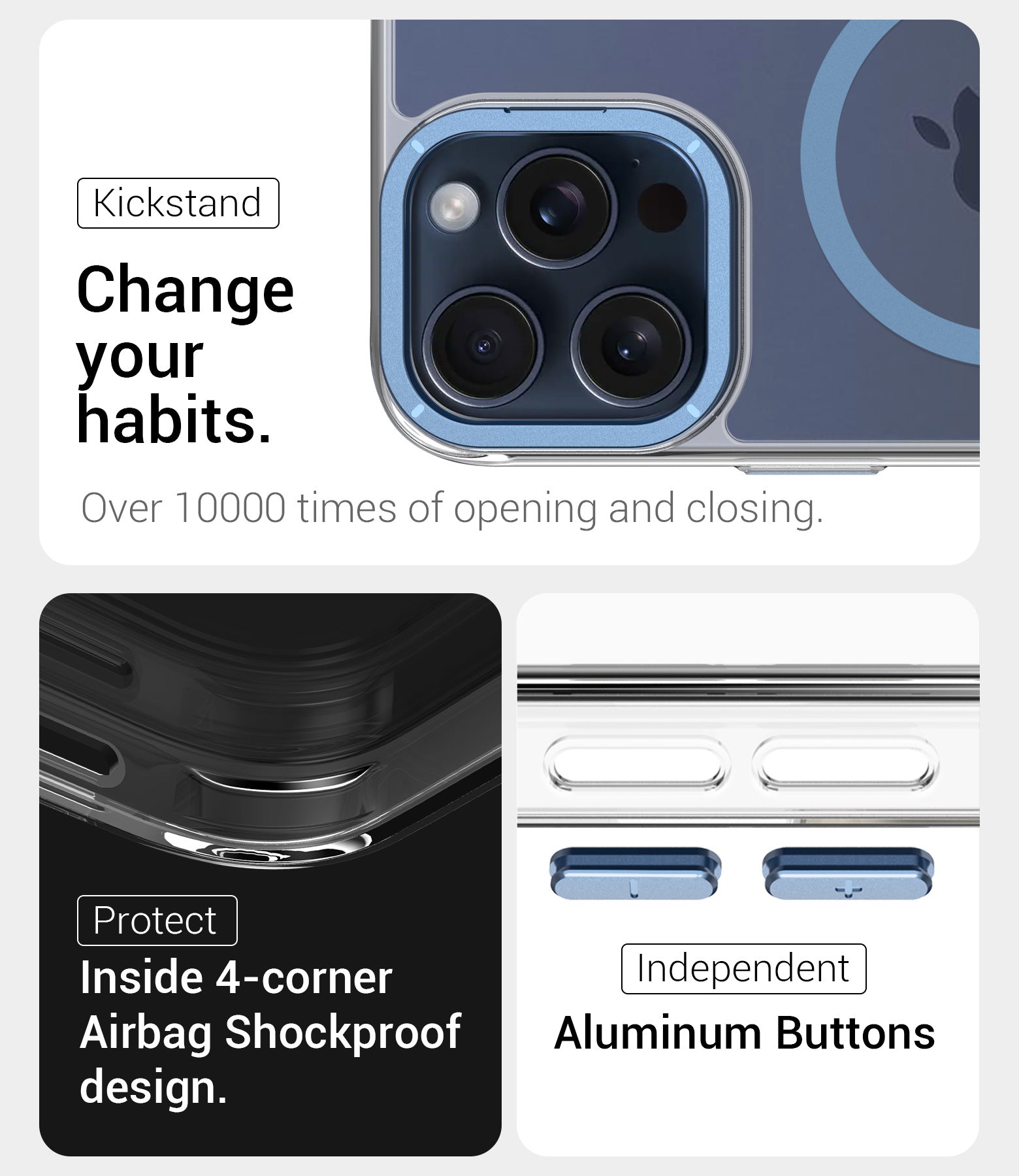 Aluminum Camera Frame with Kickstand: The integrated aluminum camera frame not only safeguards your camera but also features a durable kickstand made from zinc alloy. With a 90-degree opening, this kickstand is perfect for watching videos or performing focused tasks. Tested for durability, it offers over 10,000 cycles of opening and closing, ensuring long-lasting performance.