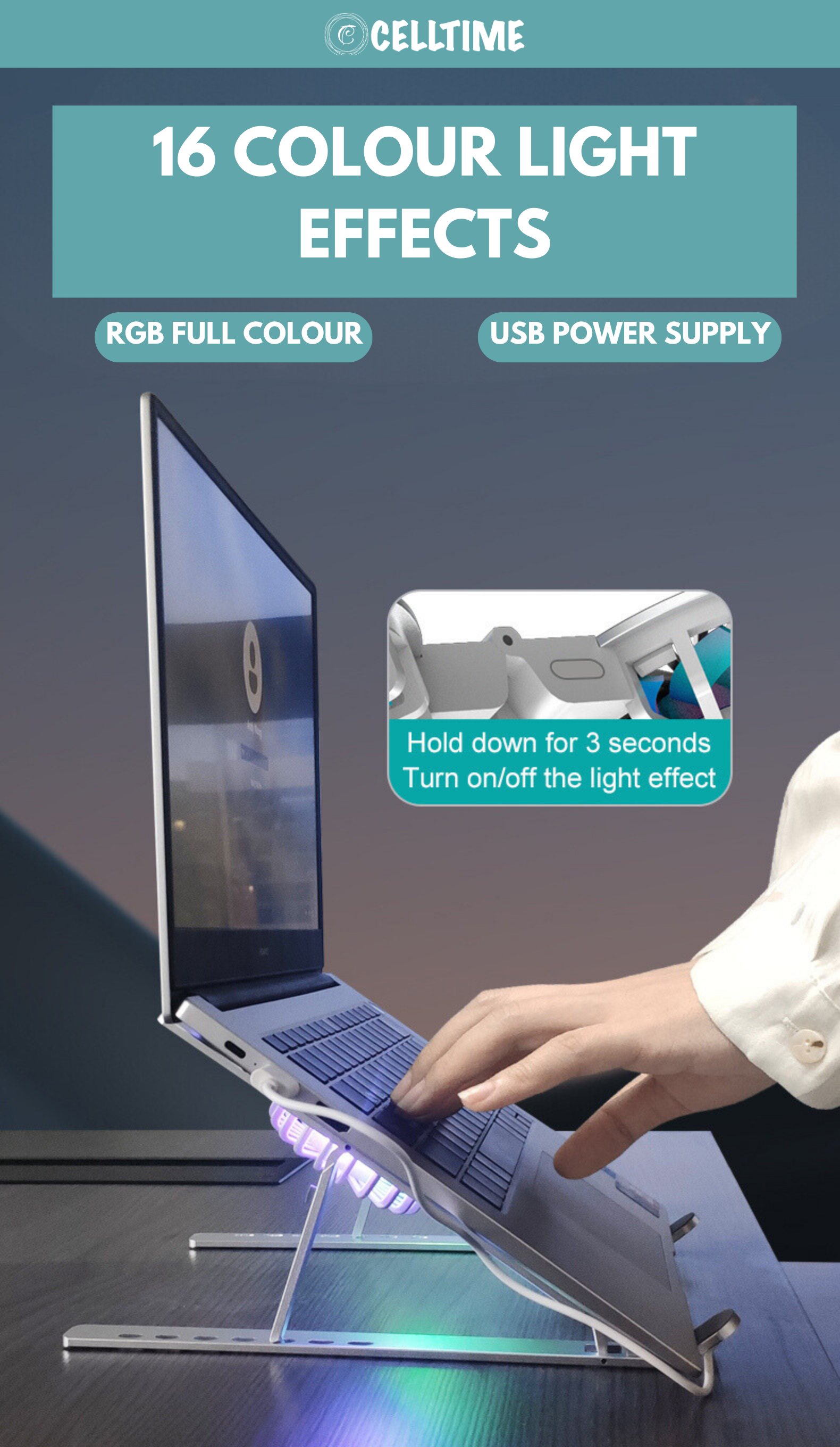 Dual Turbine Heat Dissipation with RGB Lighting: Featuring twin turbines that align with your laptop's heat vents, this stand provides rapid cooling for your device, maintaining peak performance even during high-intensity tasks. The integrated 16 customisable RGB lighting effects add a cyberpunk-inspired aesthetic, transforming your workspace with vibrant colours. Adjust the lighting to fit your mood or work environment.