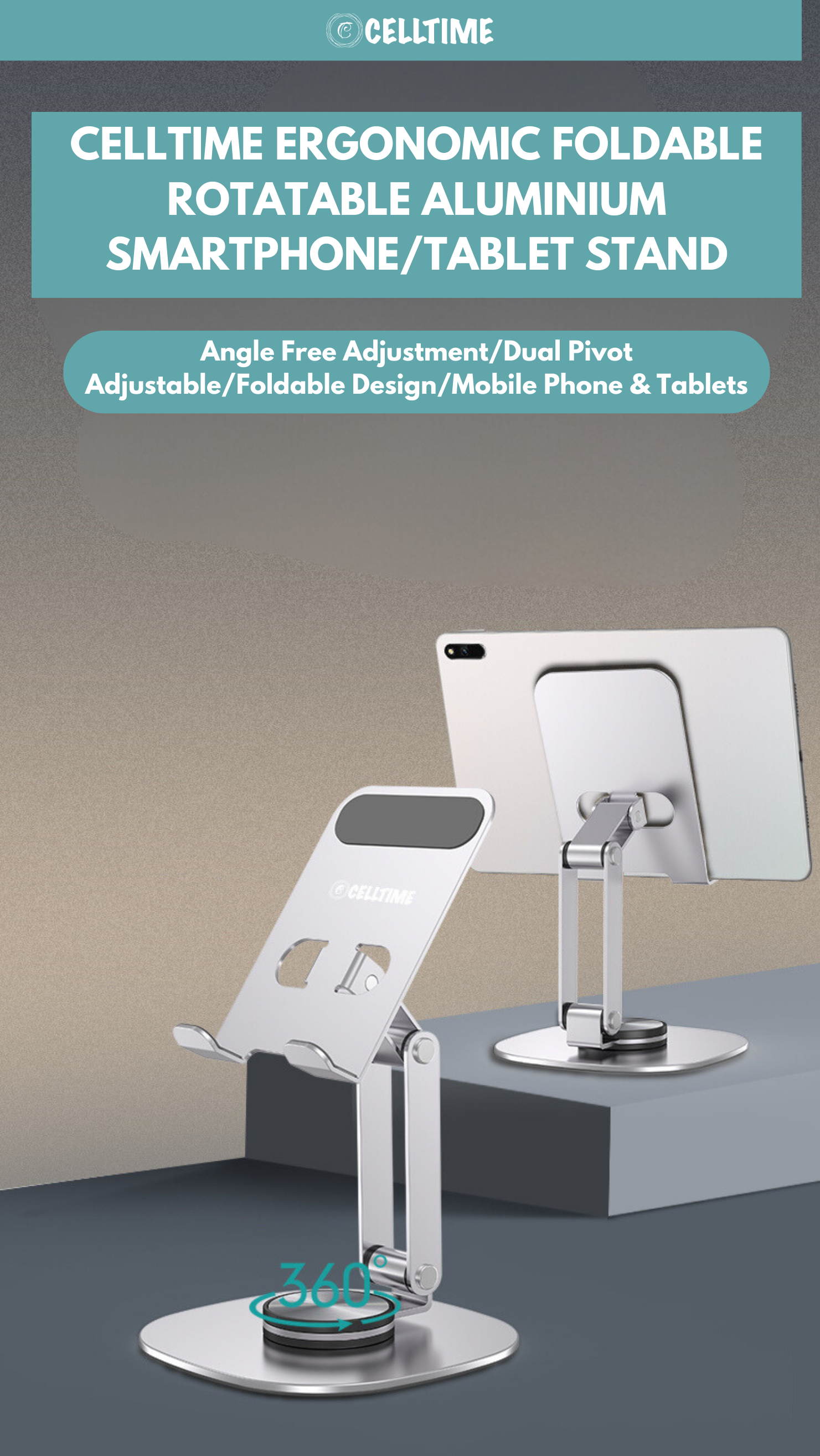 CellTime Ergonomic Foldable Rotatable Aluminium Smartphone/Tablet Stand