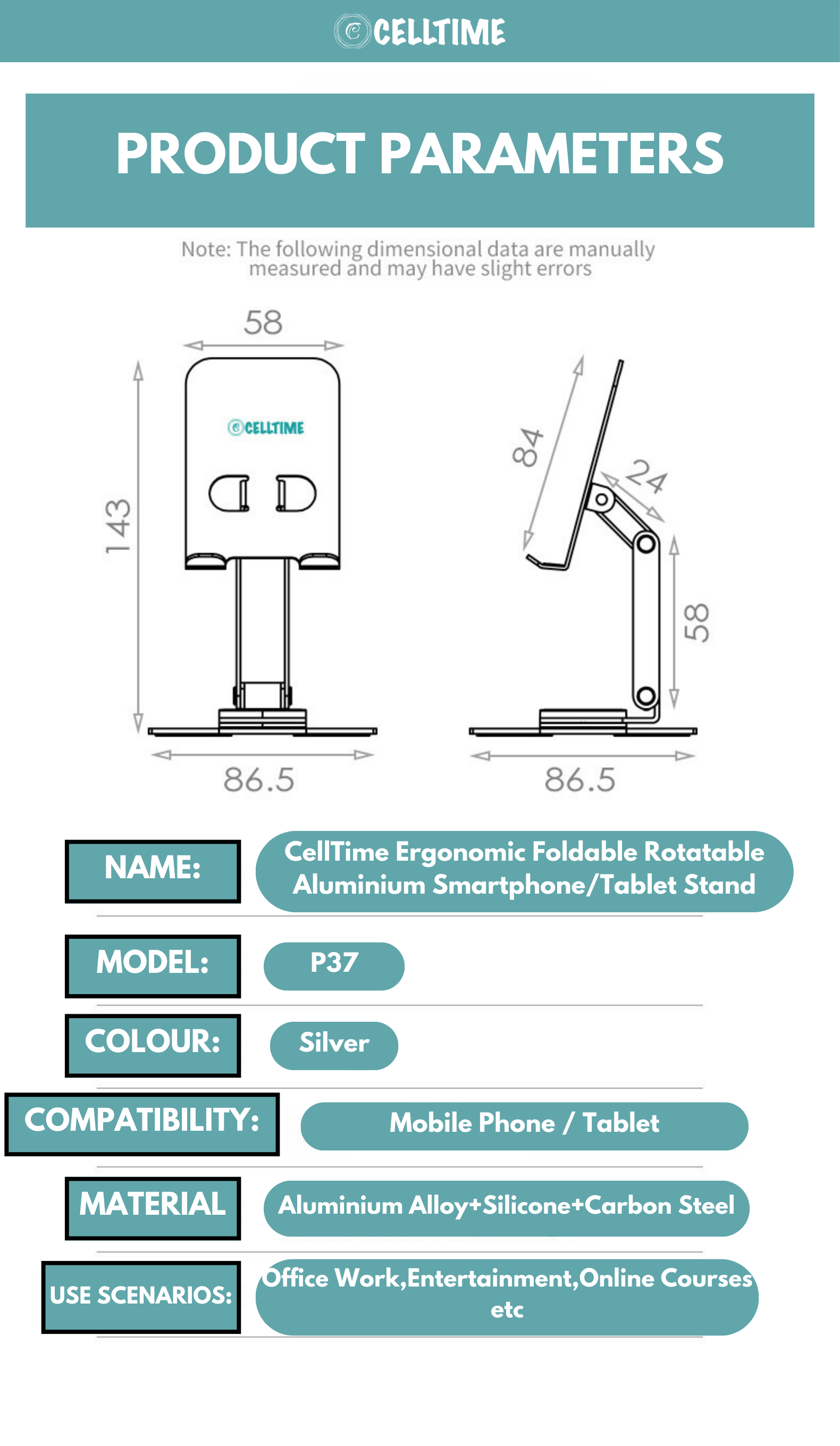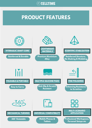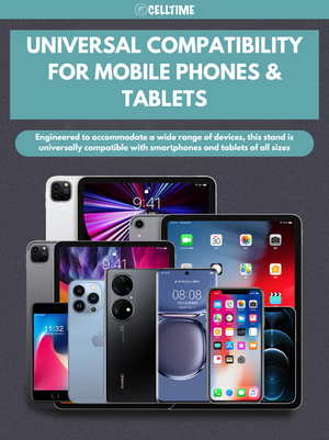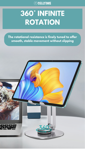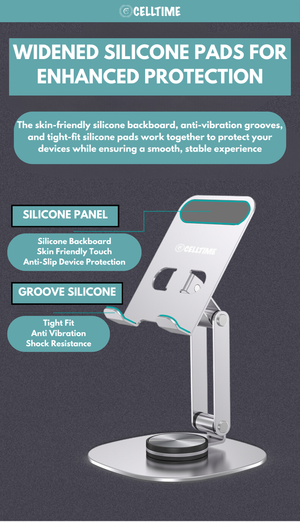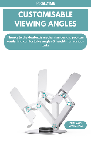 Reduce Strain, Improve Posture: The CellTime Ergonomic Foldable Rotatable Aluminium Smartphone/Tablet Stand is more than just a tablet/ phone stand-it's a solution for better ergonomics. By adjusting the height and angle, you can relieve strain on your neck, shoulders, and back, allowing for more comfortable extended use, whether you're working or unwinding.