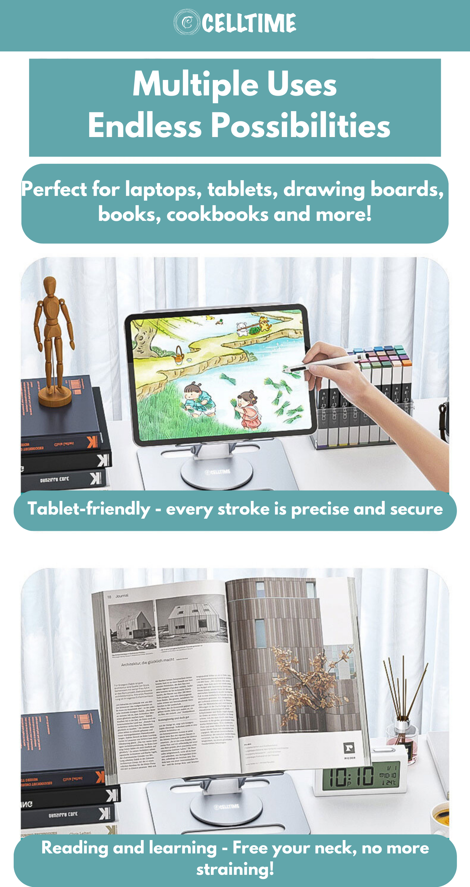 Unmatched Versatility - Multi-Device Support: Designed for more than just laptops, the CellTime A6 Laptop Stand adapts effortlessly to tablets, drawing boards, books, and more. Whether you're presenting, sketching, or cooking, this stand provides stable support, making every task easier. Its tablet-friendly design offers precise, secure strokes, perfect for creatives and artists.