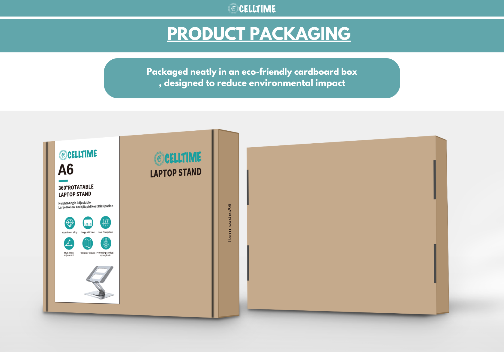 Portable, Foldable, and Travel-Ready: The CellTime A6 Laptop Stand folds flat for easy storage and portability, making it your ultimate on-the-go workstation. Whether you're traveling, changing workspaces, or attending meetings, it ensures you stay productive anywhere, anytime.