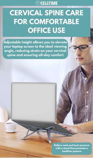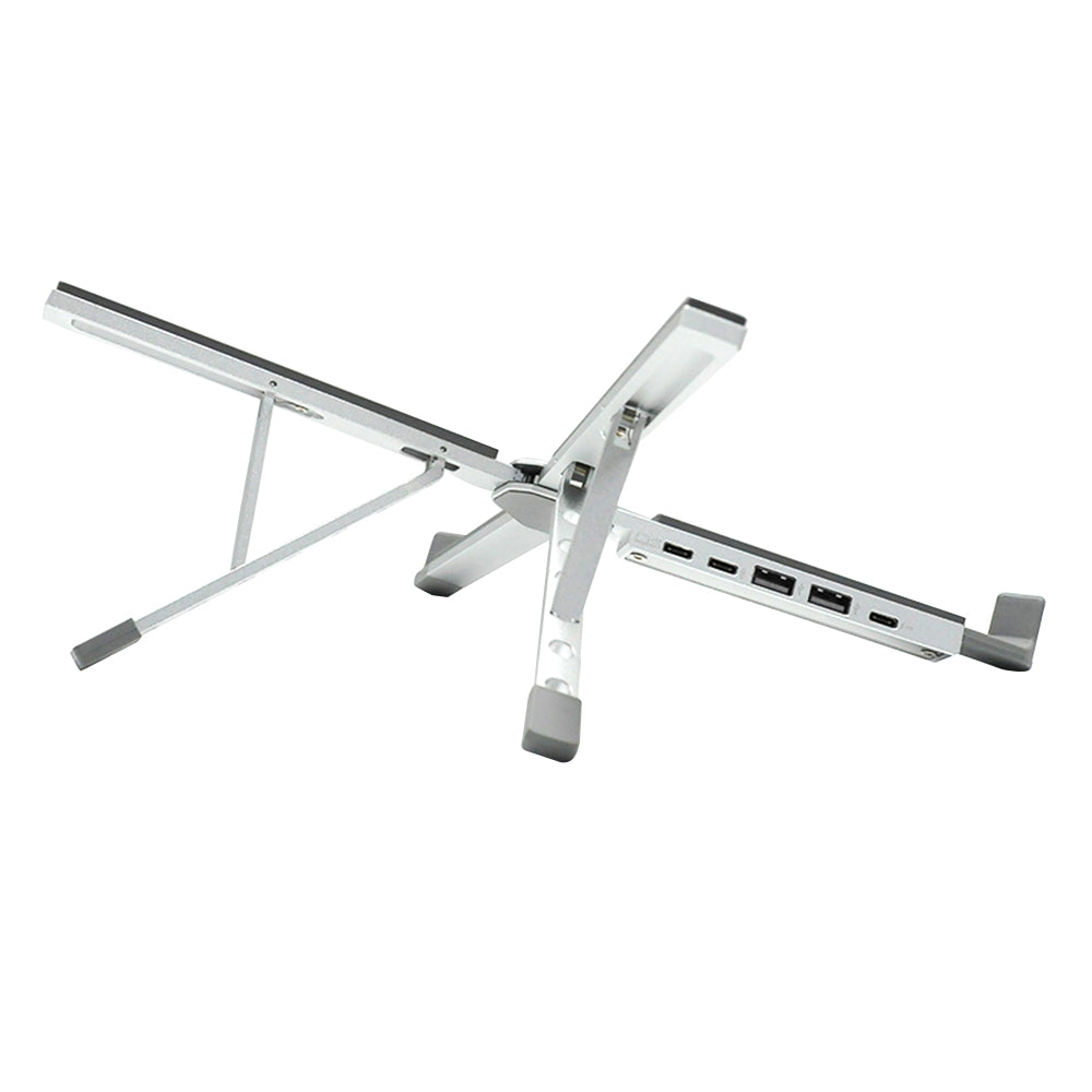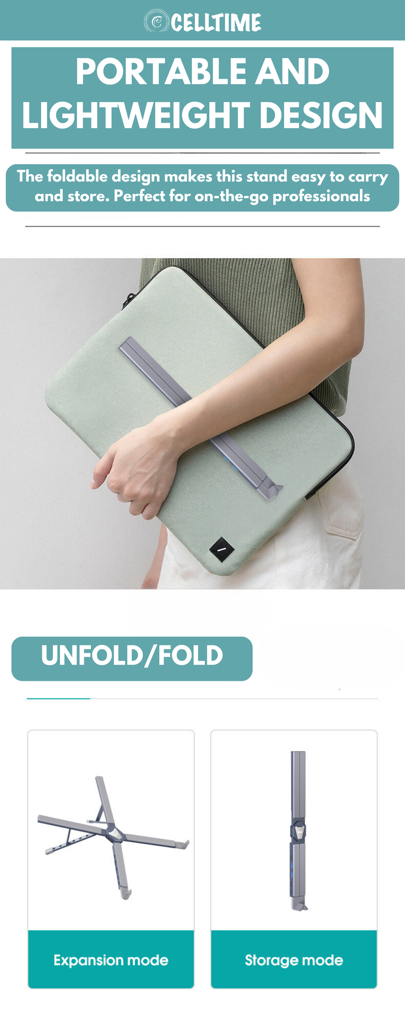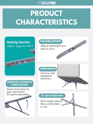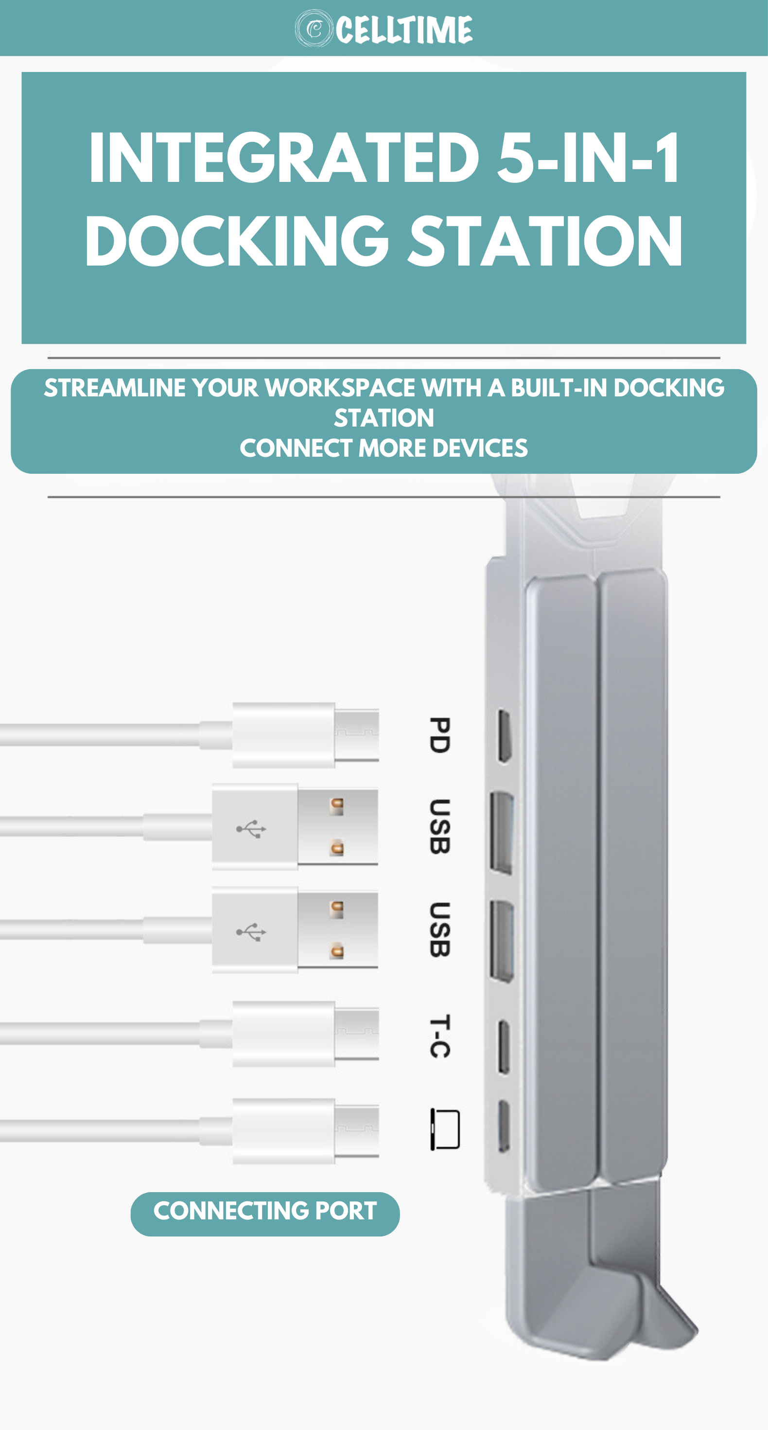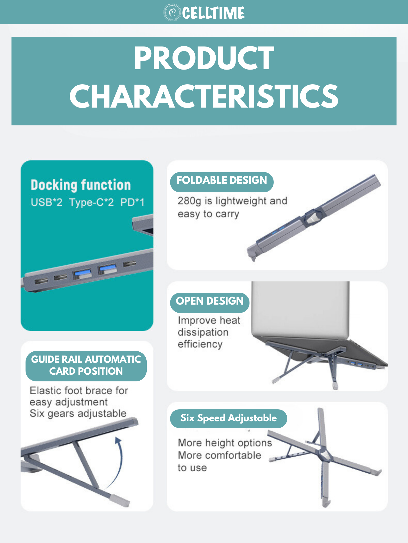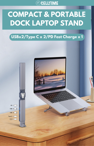 - Experience the perfect balance of functionality, portability, and comfort with the CellTime Foldable Portable Aluminium Laptop Stand with Docking Station Hub. Whether at the office, home, or on the go, this stand offers the ultimate solution for ergonomic support and expanded connectivity.