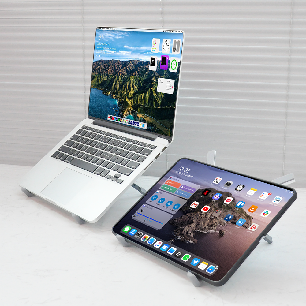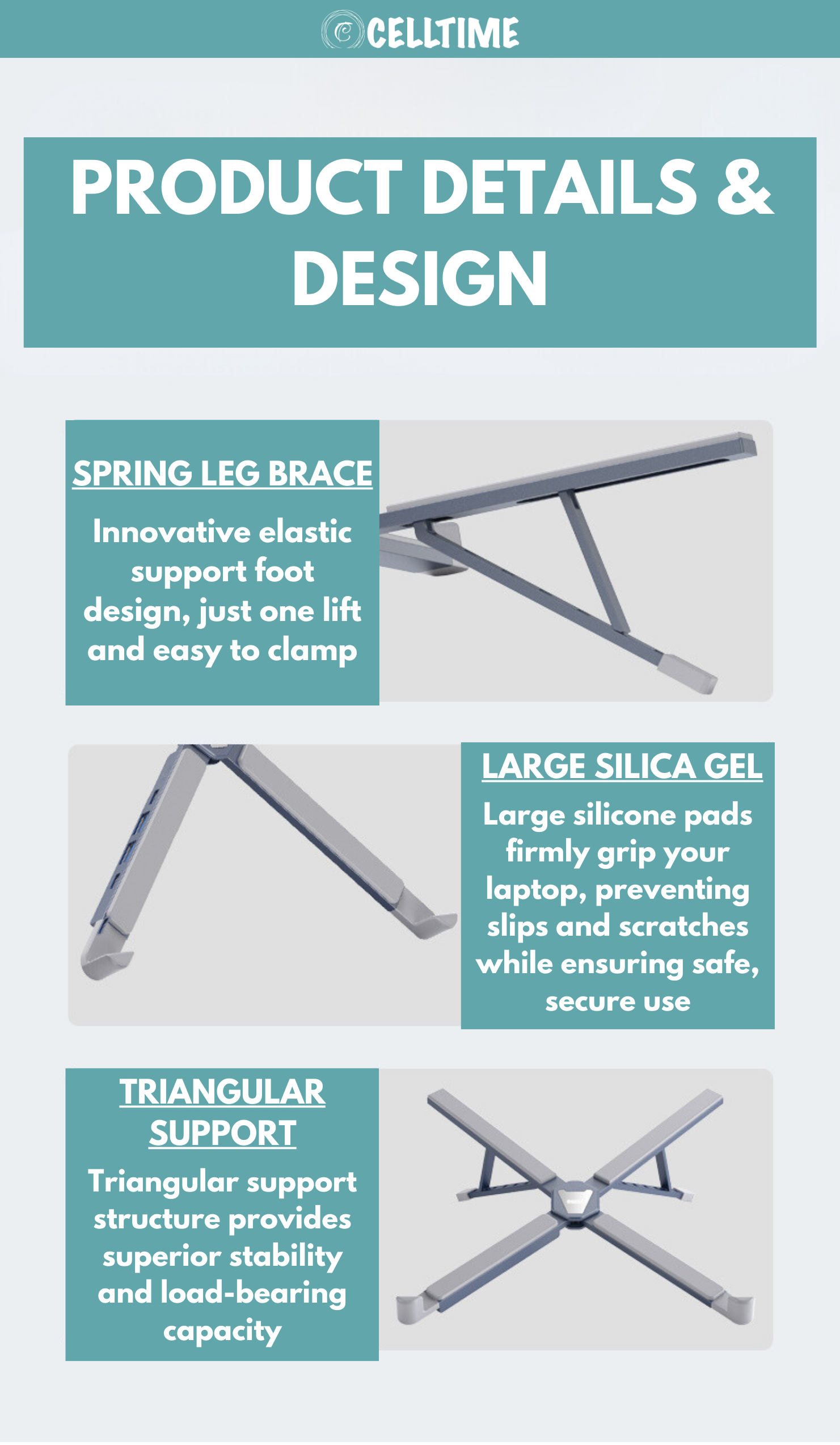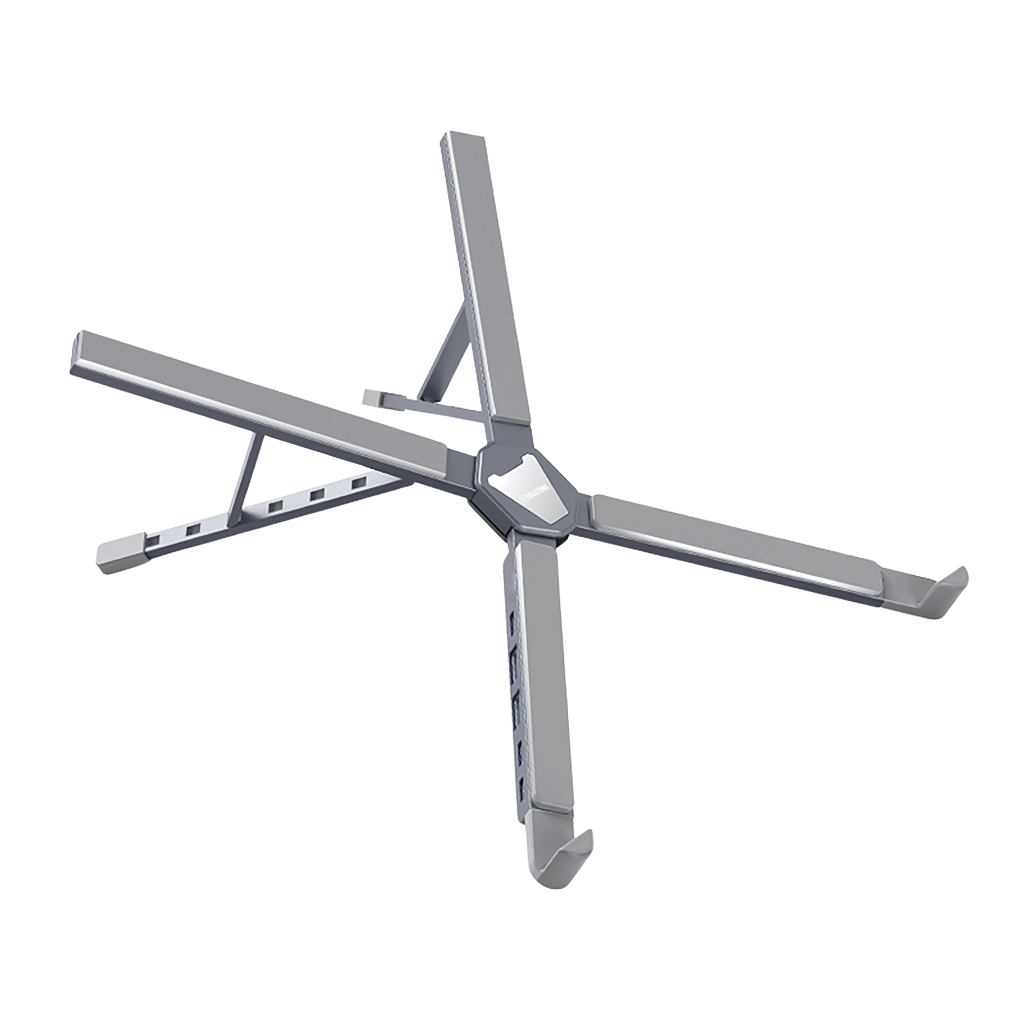 - 1 PD 100W fast charging port for uninterrupted power. - Eliminate the hassle of limited laptop interfaces and expand your device's capabilities effortlessly. - Portable and Lightweight Design: Weighing just 280g, the foldable design makes this laptop stand easy to carry and store. Perfect for on-the-go professionals, it fits neatly into any bag without adding bulk. - Efficient Heat Dissipation: The hollowed-out design enhances airflow, preventing overheating and ensuring optimal device performance even during extended use. - Spring Leg Brace with Automatic Adjustment: The innovative spring-loaded elastic foot brace ensures a secure fit for your device. The triangular support structure provides superior stability and load-bearing capacity. -Anti-Slip Silicone Pads for Secure Use: Large silicone pads firmly grip your laptop, preventing slips and scratches while ensuring safe, secure use. - Premium Aluminium Alloy Construction: Built from high-quality aluminium alloy, this laptop stand is durable yet lightweight, offering a perfect blend of strength and portability. - Wide Compatibility: Compatible with laptops, tablets, and books, the stand supports devices running Windows, macOS, Linux, Android, and Harmony OS.