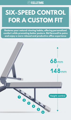 - Cervical Spine Care for a Comfortable Office Posture: Say goodbye to neck and back strain with an ergonomic laptop stand that lifts your laptop screen to a healthier, more comfortable viewing angle. With six-speed adjustable height, it helps you achieve the perfect position, alleviating neck pain and reducing cervical spine pressure for prolonged comfort. - Six-Speed Control for a Custom Fit: The six-speed height adjustment restores your natural viewing habits, offering personalised comfort while promoting better posture. Bid farewell to "phubbing" and enjoy a more relaxed and productive office experience. - Integrated 5-in-1 Docking Station: Streamline your workspace with a built-in docking station that includes: - 2 USB 2.0 ports for connecting peripherals.