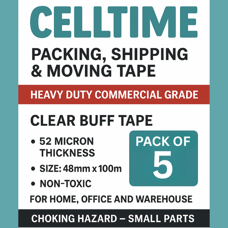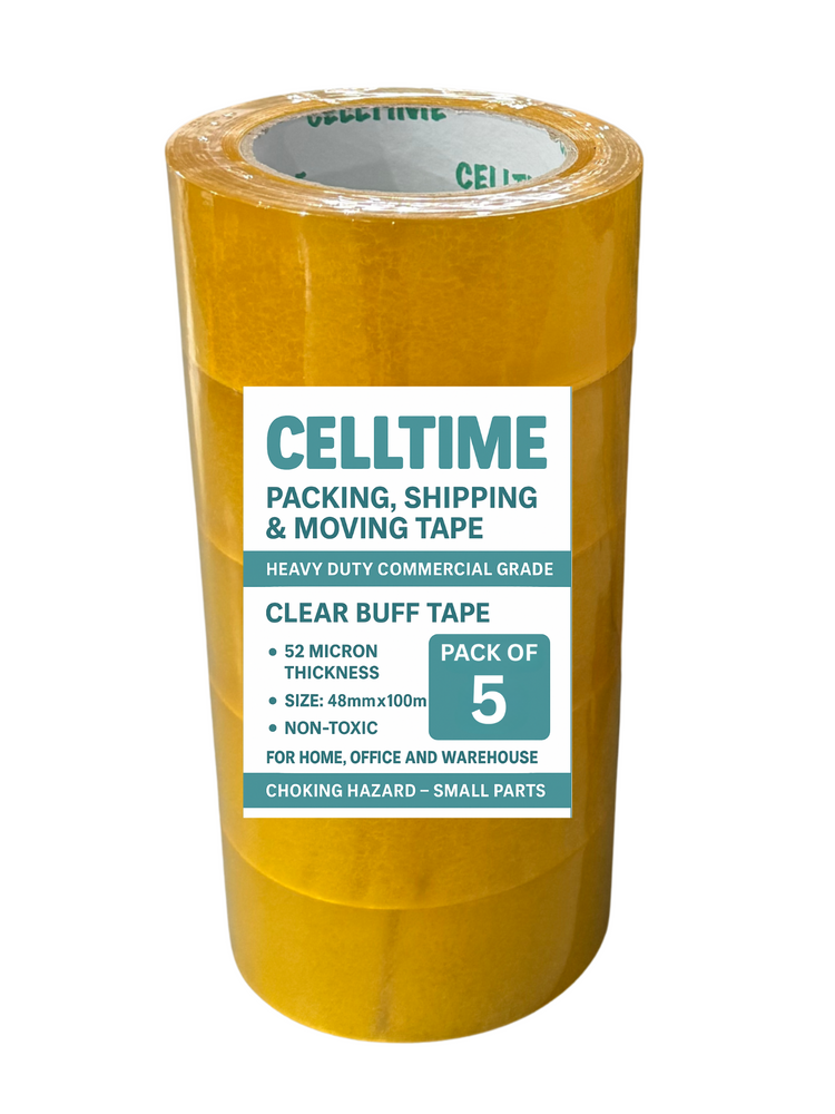 Includes 5 Rolls of CellTime Heavy-Duty Clear Packaging Buff Tape (48mm x 100m).