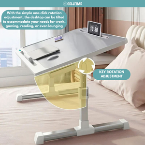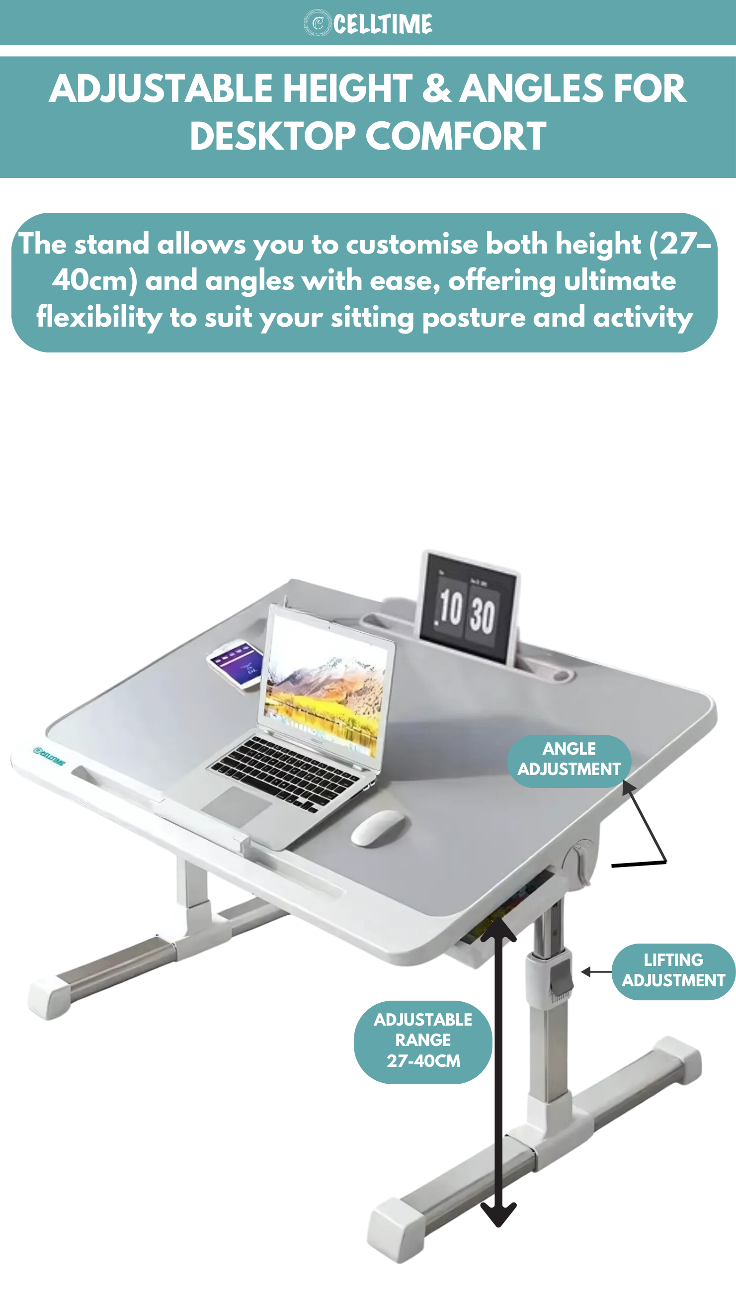 Adjustable Height & Angles for Desktop Comfort: The CellTime Laptop Desk Stand allows you to customise both height (27-40cm) and angles with ease, offering ultimate flexibility to suit your sitting posture and activity. With the simple one-click rotation adjustment, the desktop can be tilted to accommodate your needs for work, gaming, reading, or even lounging. The desk adapts to your comfort effortlessly while supporting healthy posture.