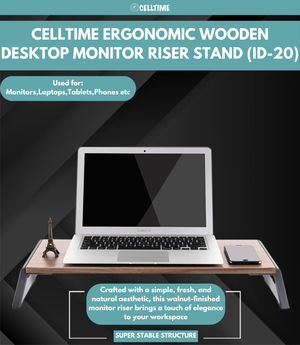 Elevate your workspace with the CellTime Multifunctional Ergonomic Wooden Desktop Monitor Riser Stand (ID-20), expertly designed to blend functionality, style, and comfort. Crafted for those who value a tidy and ergonomic workstation, this sleek walnut-finished riser provides enhanced organisation, superior stability, and improved posture, making it a must-have for any modern desk setup.