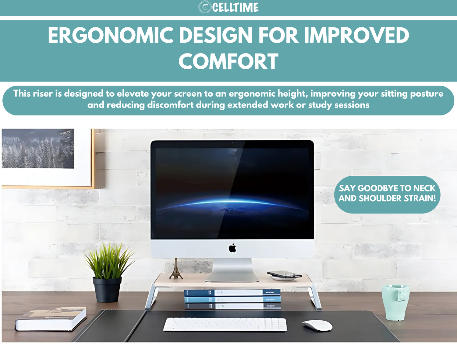 This monitor riser stand is not just a stand; it's a complete workspace upgrade. It simplifies your desk setup, offering a sleek solution to organise clutter while delivering ergonomic benefits. With its fashionable design, sturdy construction, and excellent functionality, the CellTime Ergonomic Wooden Desktop Monitor Riser Stand transforms any desk into a stylish and efficient workstation.
