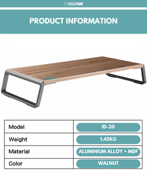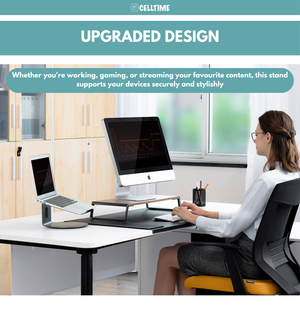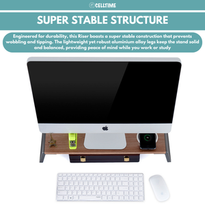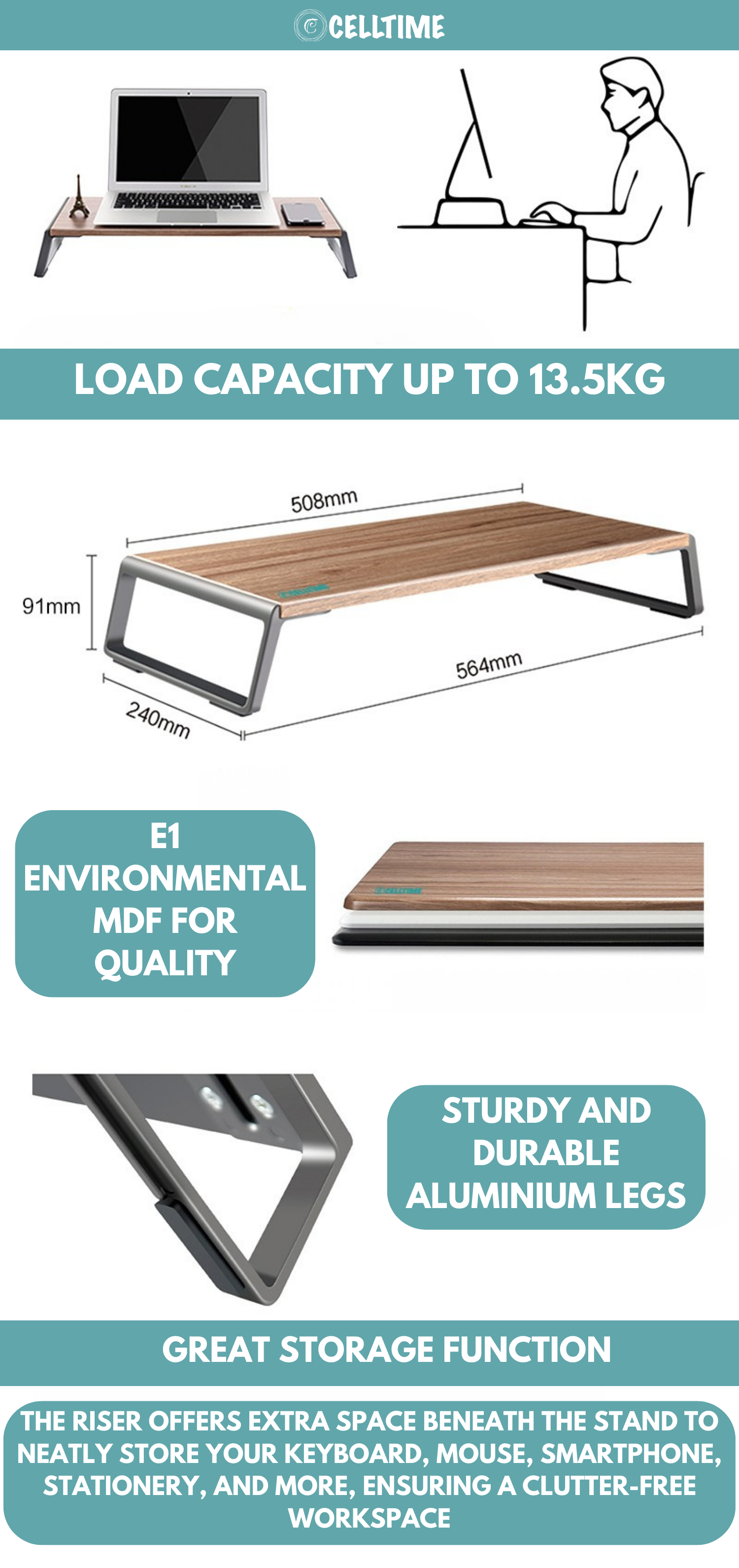 Sturdy and Durable Build: Built to last, the CellTime Riser Stand features premium aluminium alloy legs paired with E1 environmental MDF board for a lightweight yet highly durable structure. The monitor riser stand can effortlessly support devices up to 13.5kg, ensuring reliable stability for even the heaviest monitors. With anti-slip silicone pads on its aluminium feet, your devices stay secure and stable, even on smooth surfaces.