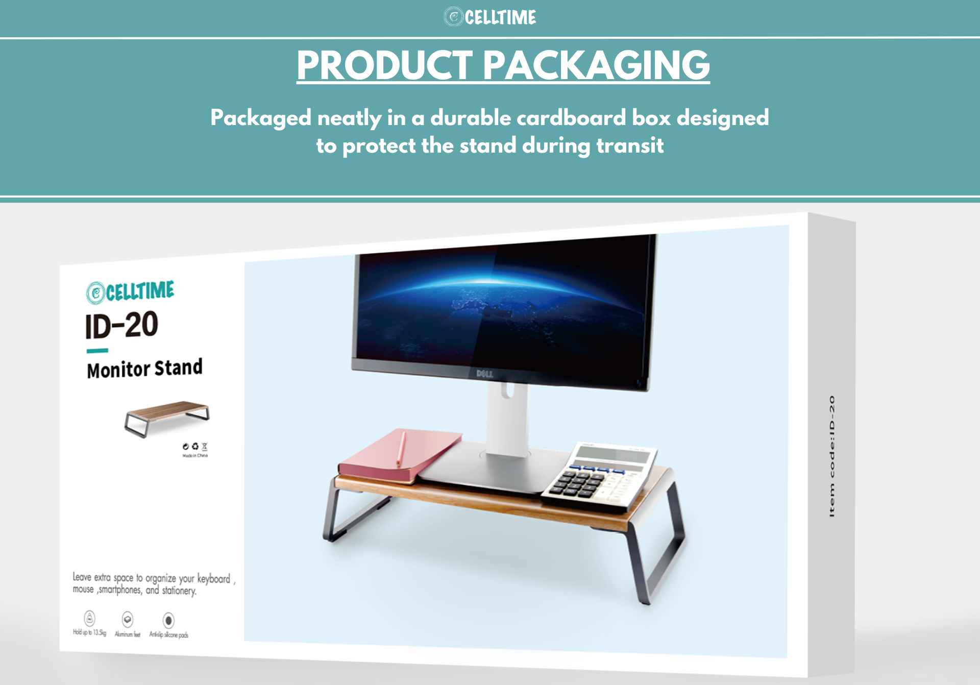 Secure Packaging: The CellTime Ergonomic Wooden Desktop Monitor Riser Stand comes securely packaged in a durable cardboard box designed to protect the stand during transit.