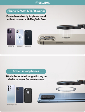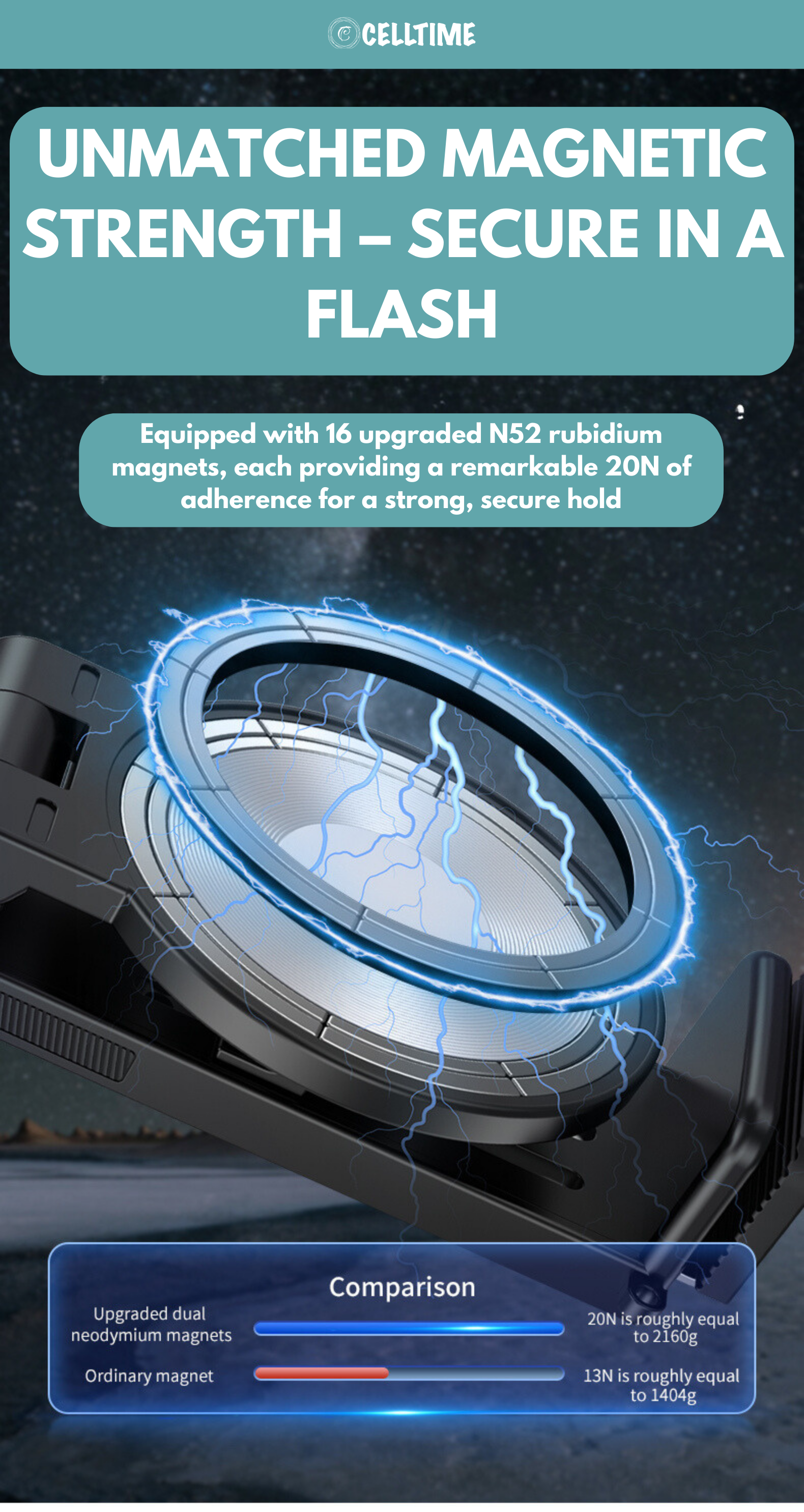 Unmatched Magnetic Strength - Secure in a Flash: Equipped with 16 upgraded N52-grade neodymium magnets, this holder delivers exceptional magnetic strength, providing a secure and stable grip for your phone. The one-second magnetic attachment allows you to secure your phone effortlessly with one hand, while its wide compatibility ensures support for MagSafe-enabled devices like the iPhone 12/13/14/15/16 series. For non-MagSafe devices, simply attach the included magnetic ring for the same reliable performance.