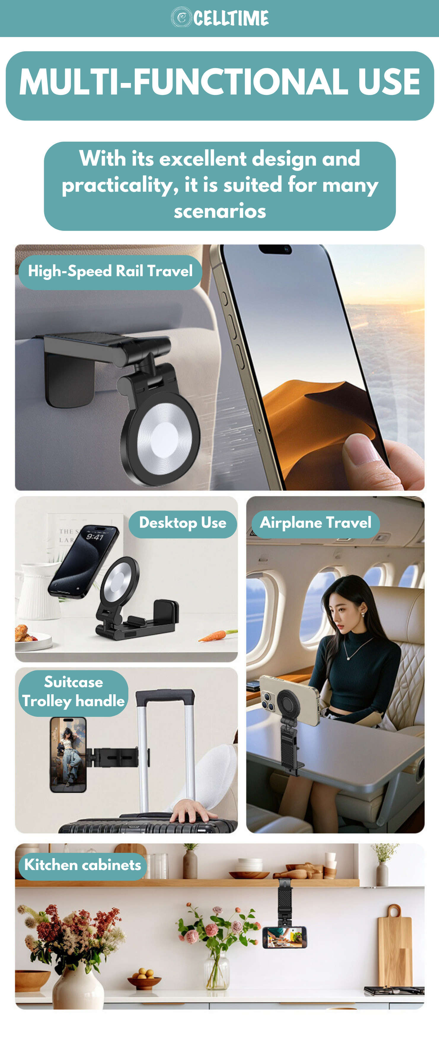 Transform the way you use your phone during travel or at home with the CellTime Multifunctional MagSafe Airplane/Desk/Train Phone Holder Mount. Compact, powerful, and versatile, this innovative accessory is designed to provide seamless convenience for work, entertainment, and exploration-anytime, anywhere.