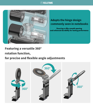 Durable and Sleek Construction: The hinge-inspired design, inspired by notebook mechanics, ensures smooth opening and reliable durability for long-lasting use. A strengthened steel clamp base securely grips surfaces up to 35mm wide, providing unmatched stability in diverse settings.