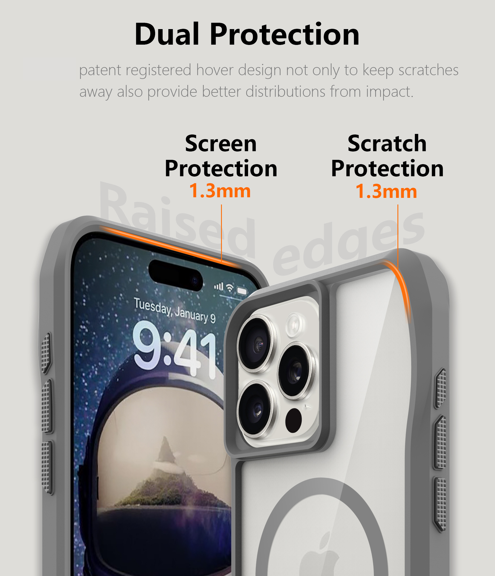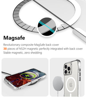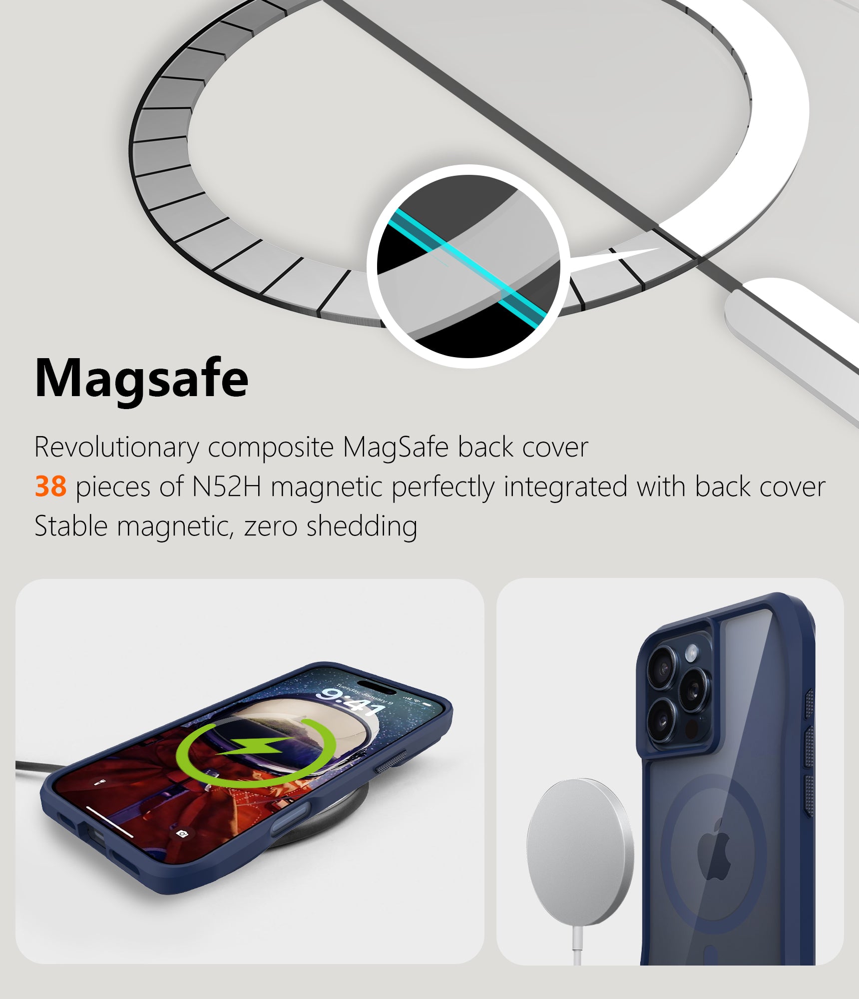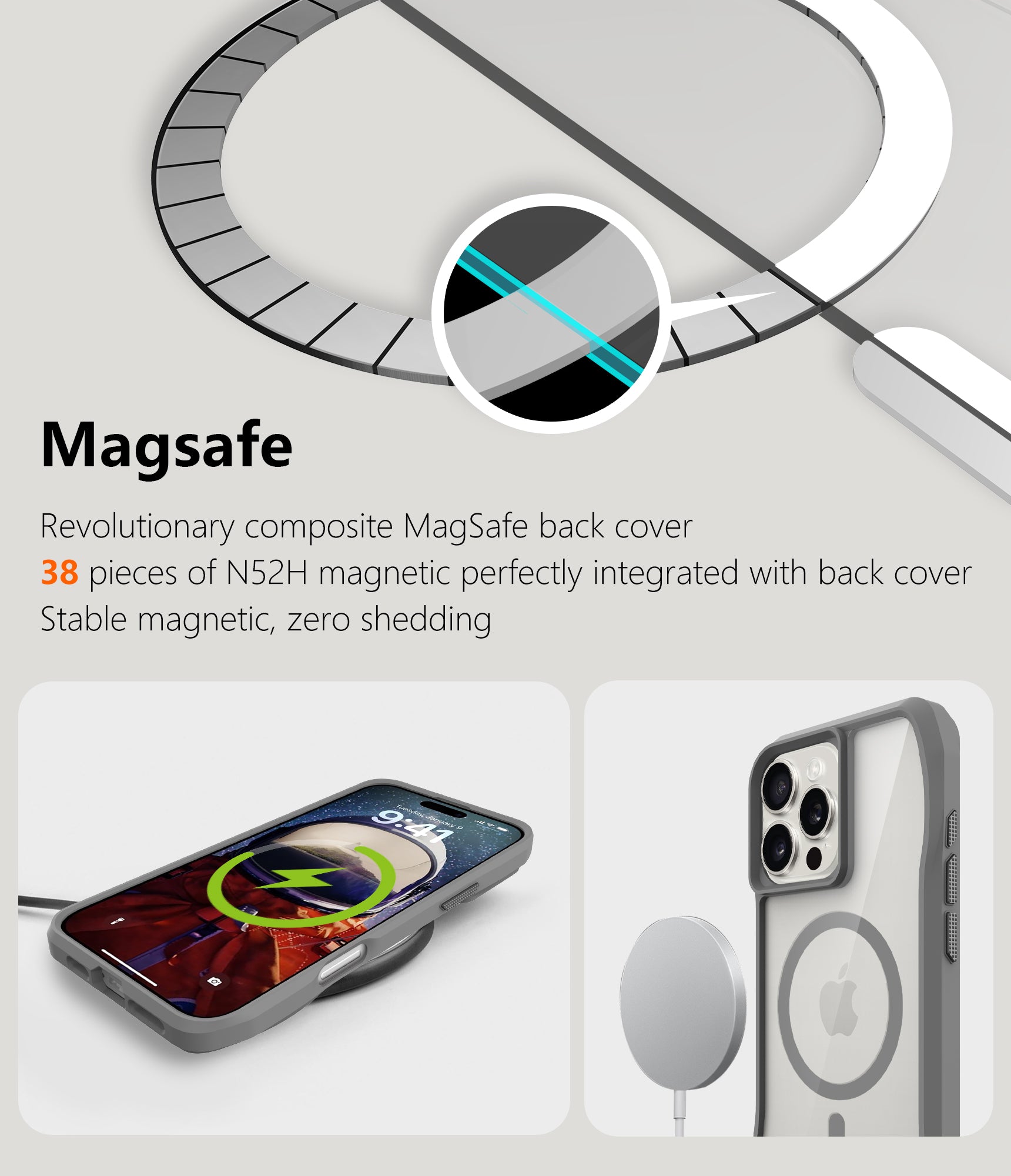 MagSafe Compatibility with N52H Magnets: Featuring a revolutionary composite MagSafe back cover, this case includes 38 pieces of N52H magnets perfectly integrated into the back for stable magnetic connection. The zero-shedding design ensures secure attachment to your MagSafe accessories and wireless chargers, offering seamless charging and functionality without removing the case.