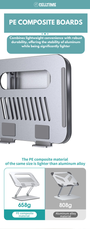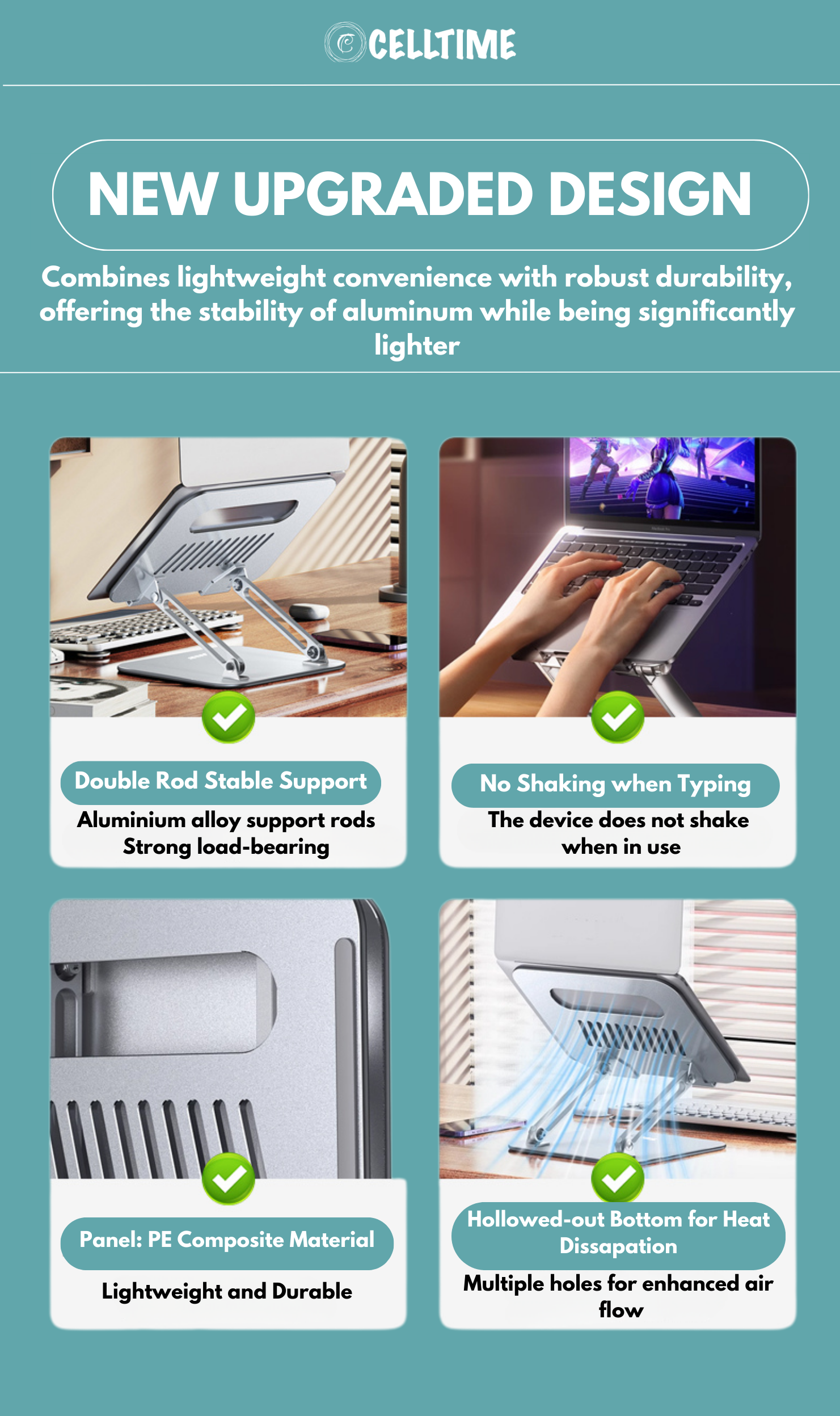 Transform your workspace with the CellTime QS2 Laptop Stand, crafted for maximum stability, ergonomic comfort, and seamless portability. Designed for professionals, students, and creatives, this stand combines lightweight construction, durable materials, and advanced adjustability to deliver unparalleled performance.