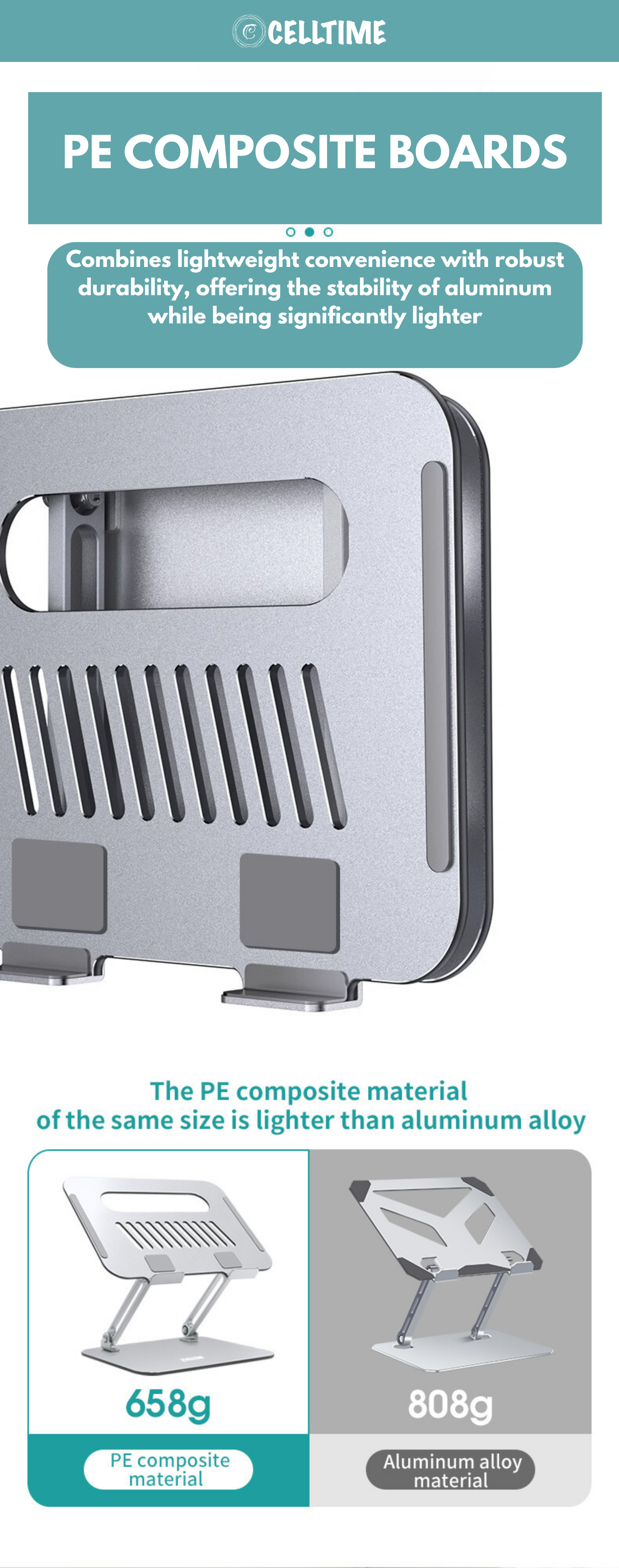 Portable & Compact Design: At just 658g, this lightweight stand folds easily for travel or storage, making it the perfect companion for on-the-go professionals. Its compact design allows it to seamlessly overlap with your laptop, saving space and adding convenience.
