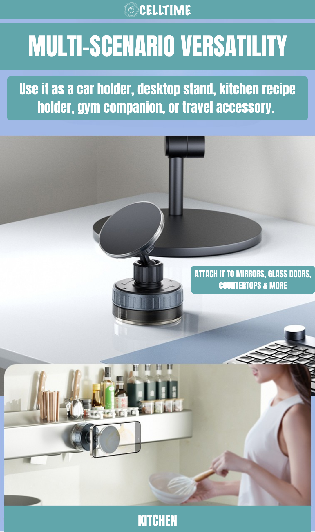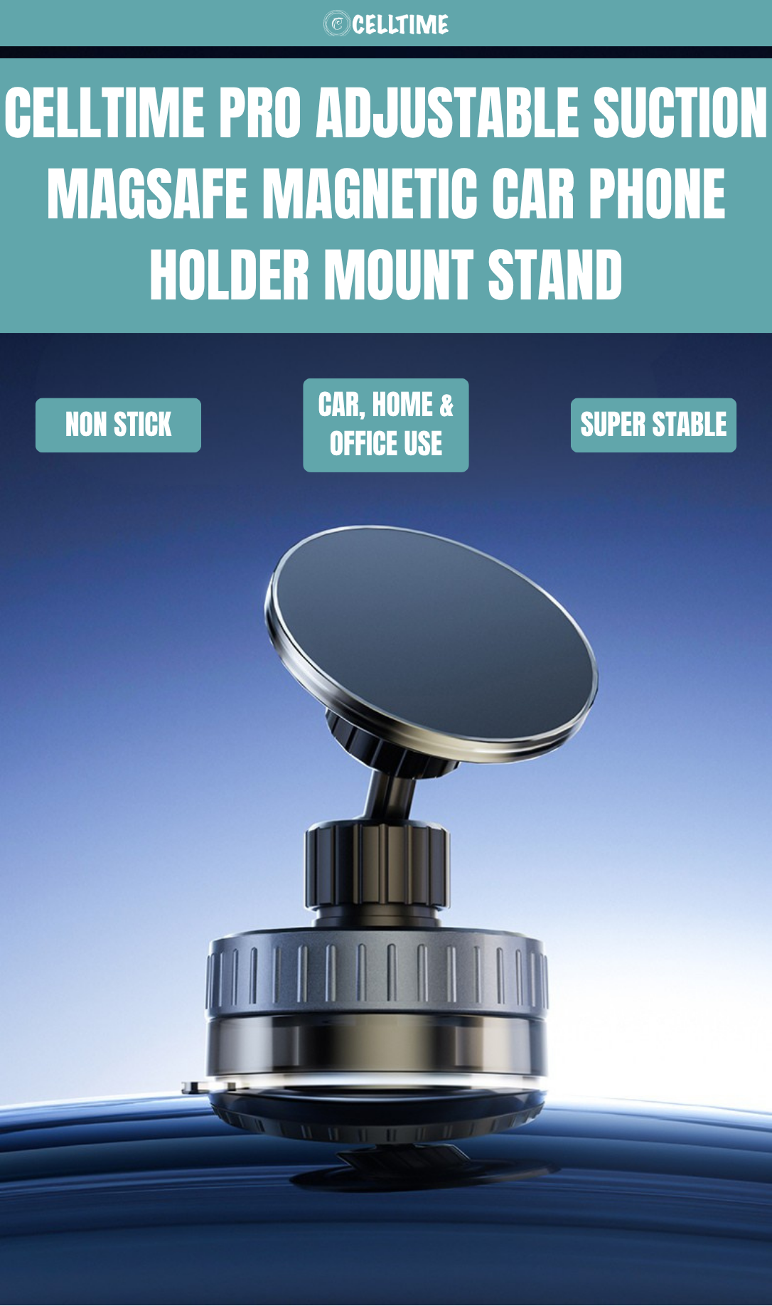 Experience next-level convenience and stability with the CellTime Pro Adjustable Suction MagSafe Magnetic Car Phone Holder Mount. Designed for car, home, and travel use, this innovative hone stand mount combines vacuum-based suction technology with N52 strong magnetic absorption to securely hold your phone in any scenario. From navigating on the road to hands-free viewing at your desk or kitchen counter, it delivers flexible, stable, and effortless usability.