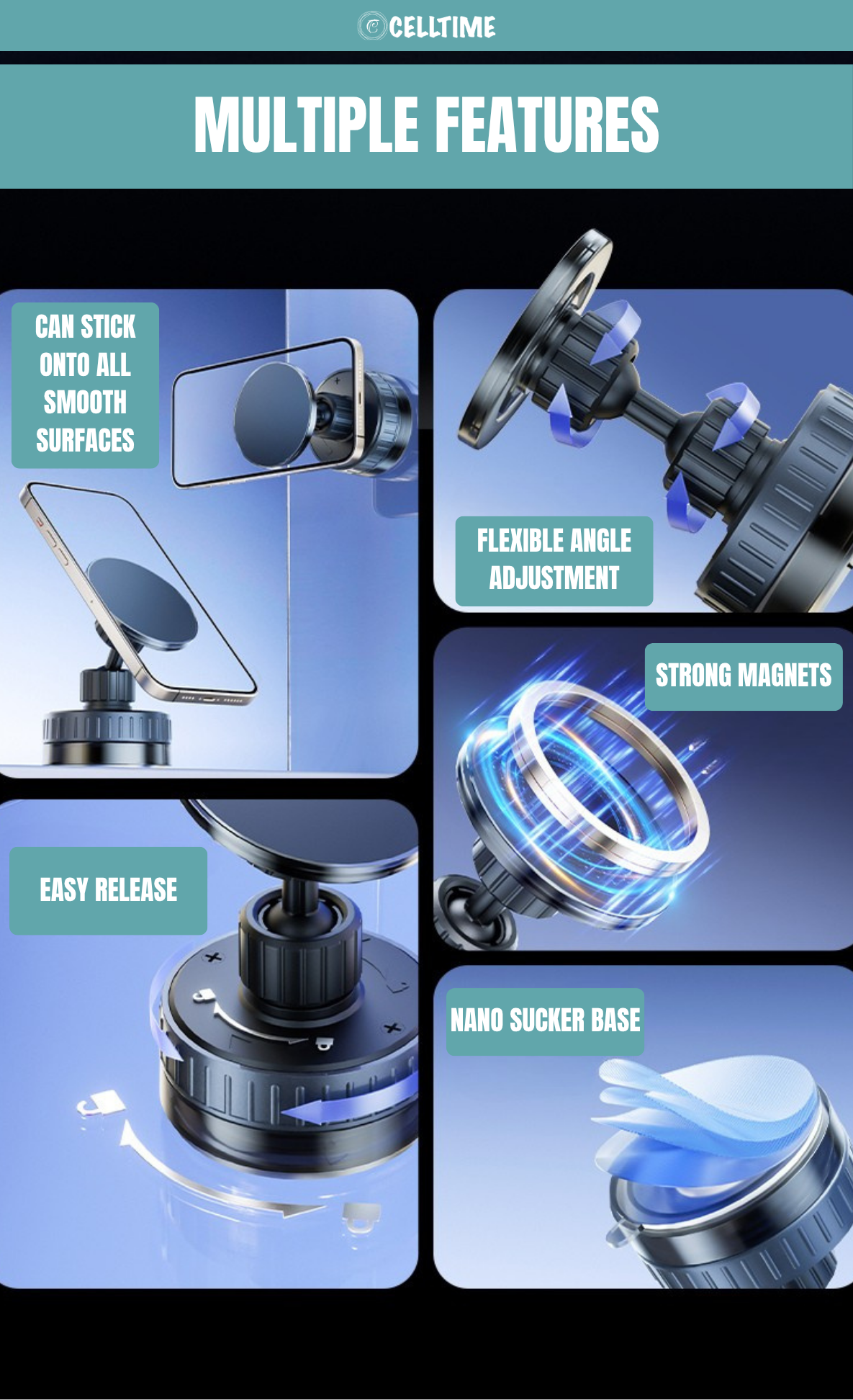 The CellTime Pro Adjustable Suction MagSafe Car Phone Holder Mount Stand is more than a phone holder-it's a multi-purpose, high-strength, MagSafe-ready mount designed to adapt to your lifestyle. With vacuum nano suction, unshakable magnetic grip, and 360 flexibility, it delivers effortless usability and lasting reliability in every scenario.