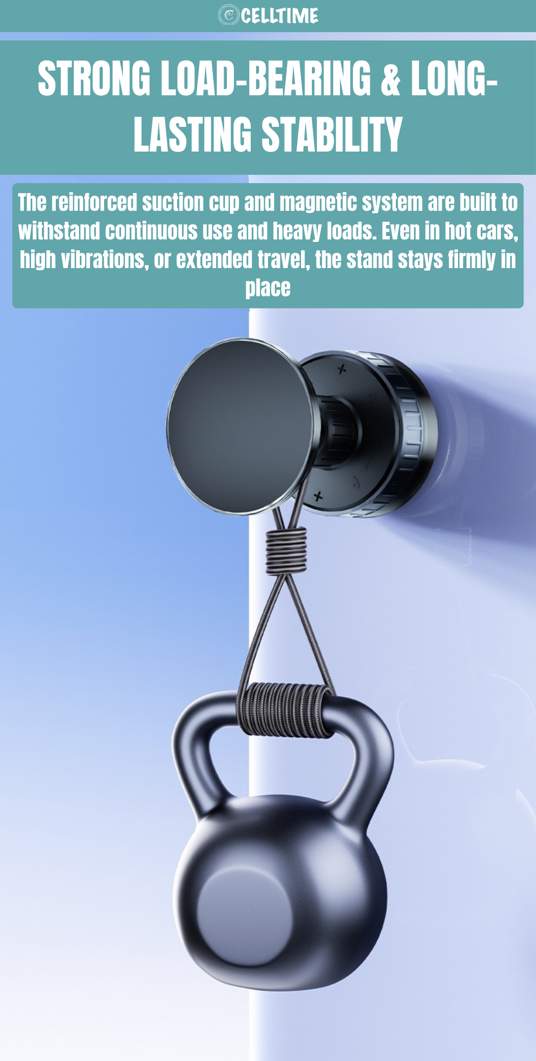 Strong Load-Bearing & Long-Lasting Stability: The reinforced suction cup and magnetic system are built to withstand continuous use and heavy loads. Even in hot cars, high vibrations, or extended travel, the stand stays firmly in place-no slipping, no falling.