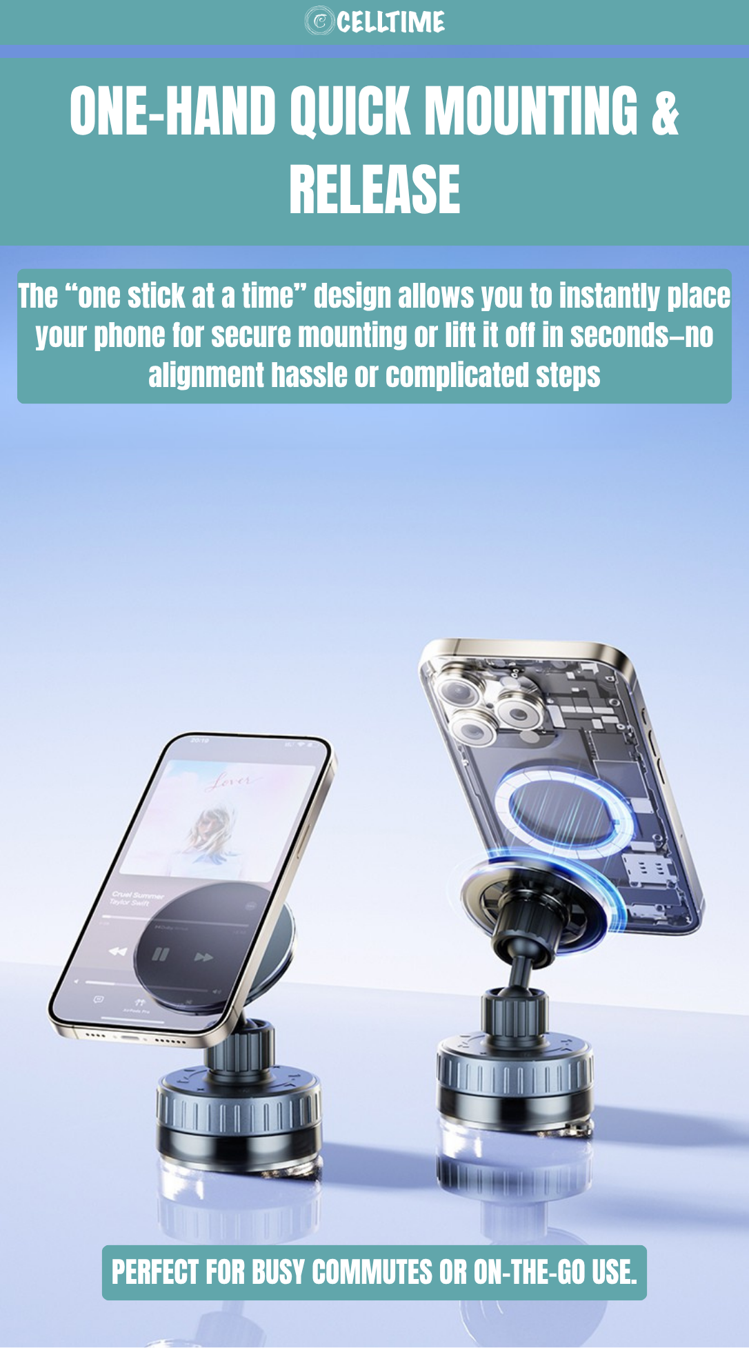 One-Hand Quick Mounting & Release: Simplify your routine with single-hand operation. The "one stick at a time" design allows you to instantly place your phone for secure mounting or lift it off in seconds-no alignment hassle or complicated steps. Perfect for busy commutes or on-the-go use.