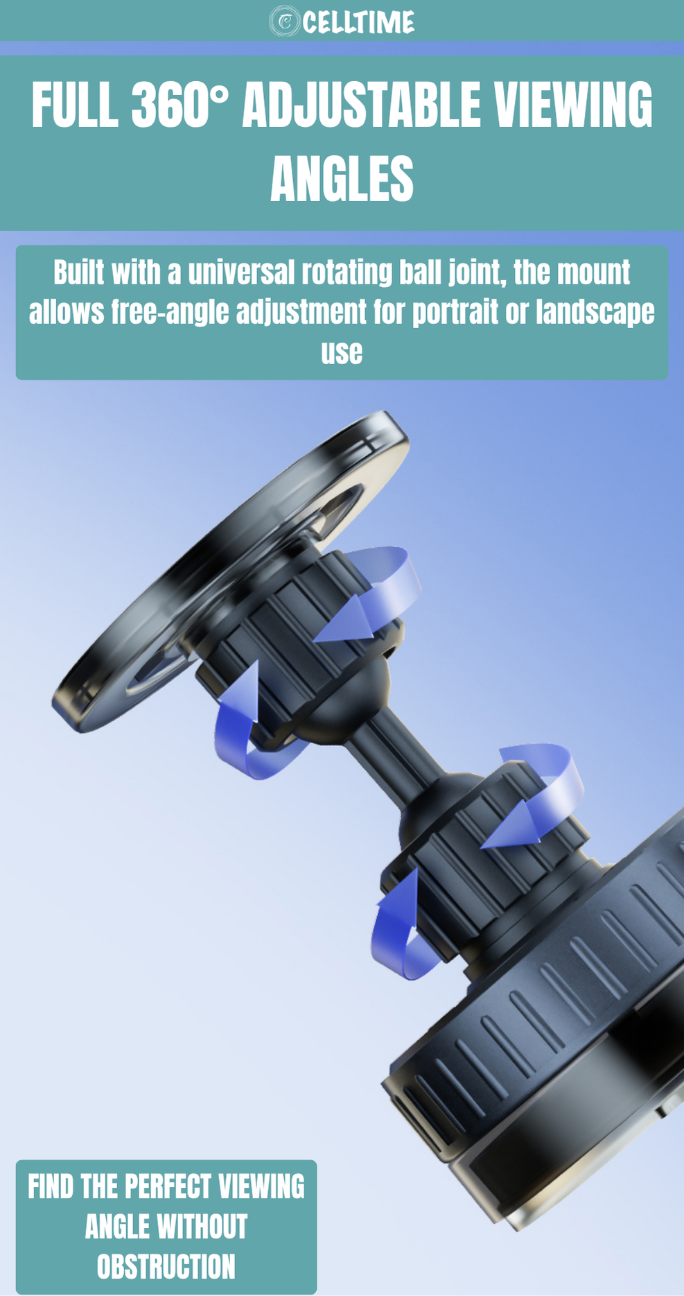 Full 360 Adjustable Viewing Angles: Built with a universal rotating ball joint, the magnetic phone stand mount allows free-angle adjustment for portrait or landscape use. Whether you're checking navigation, taking a video call, or streaming in the kitchen, you'll always find the perfect viewing angle without obstruction.