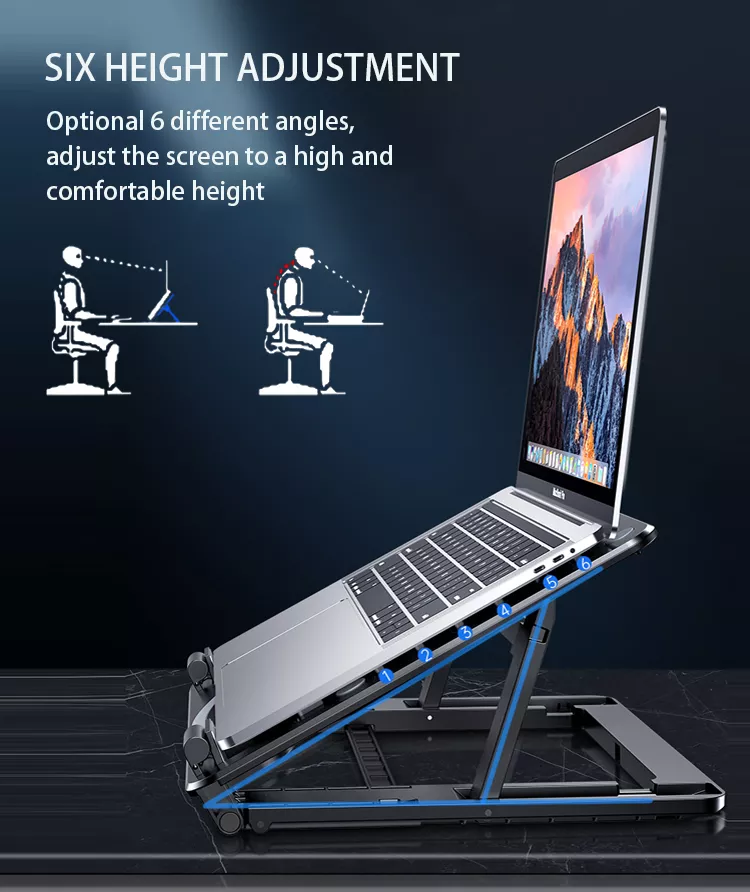 Ergonomic Design - The notebook cooler has a unique design and adjustable tilting. 6 heights adjustment allow you to raise your viewing and typing experience, thus relieving the pain on your neck and back.