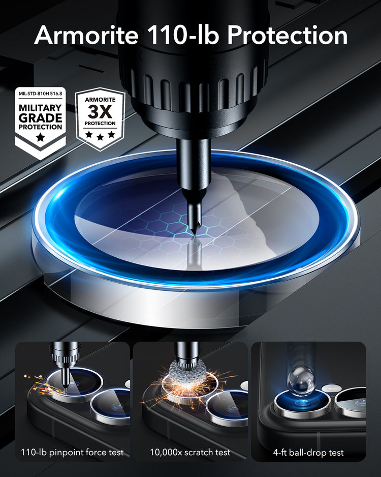 Choose the ESR Armorite Camera Lens Protectors to keep your 16 Pro/ 16 Pro Max camera lenses in perfect condition with industry-leading impact resistance, scratch protection, and HD clarity. Whether you're a photography enthusiast or simply want the best for your device, Armorite protectors offer peace of mind and premium protection.