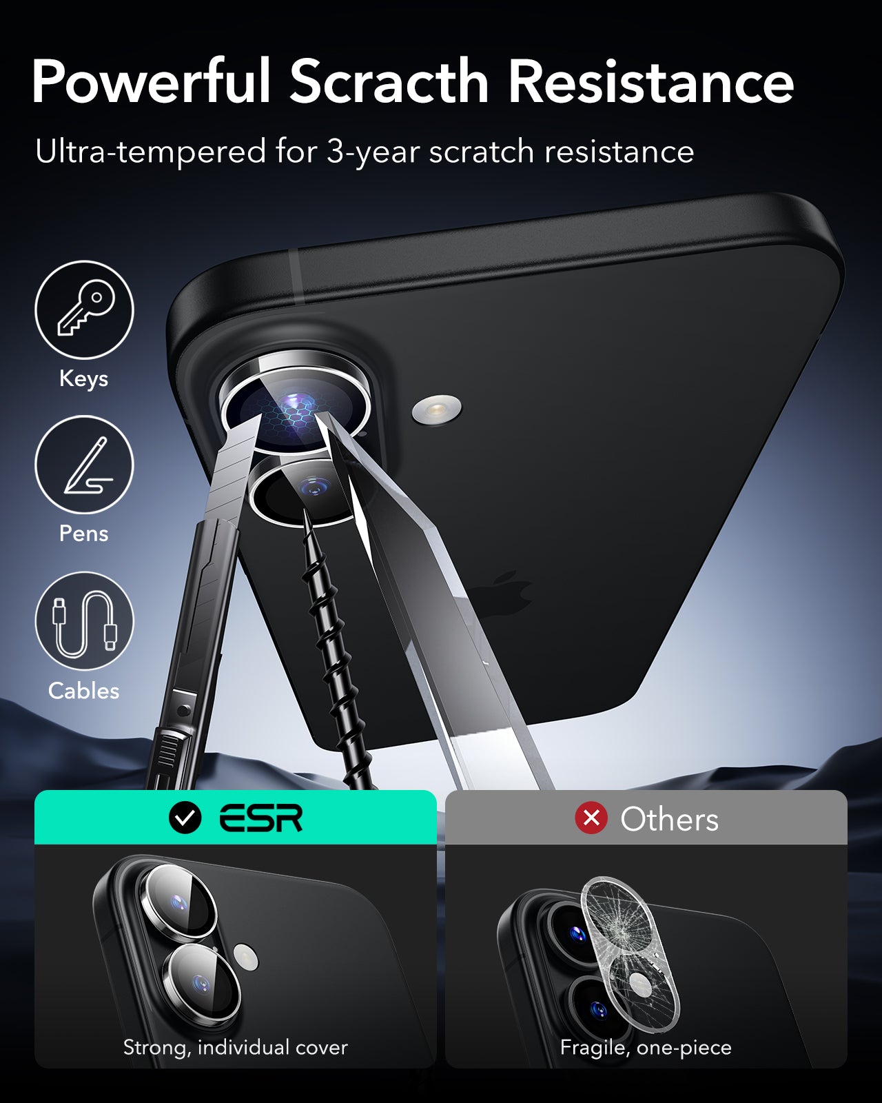 Powerful Scratch Resistance Against Daily Hazards: The ESR Armorite camera lens protectors for 16 Pro/ 16 Pro Max feature robust scratch resistance, with ultra-tempered glass that shields your lenses from routine threats like pocket debris, dust, and sharp objects. Designed for up to 3 years of scratch protection, these protectors keep your lenses flawless, whether you're storing your phone in a bag or using it daily.