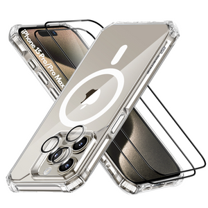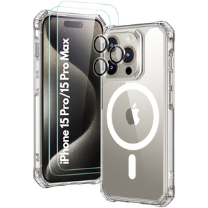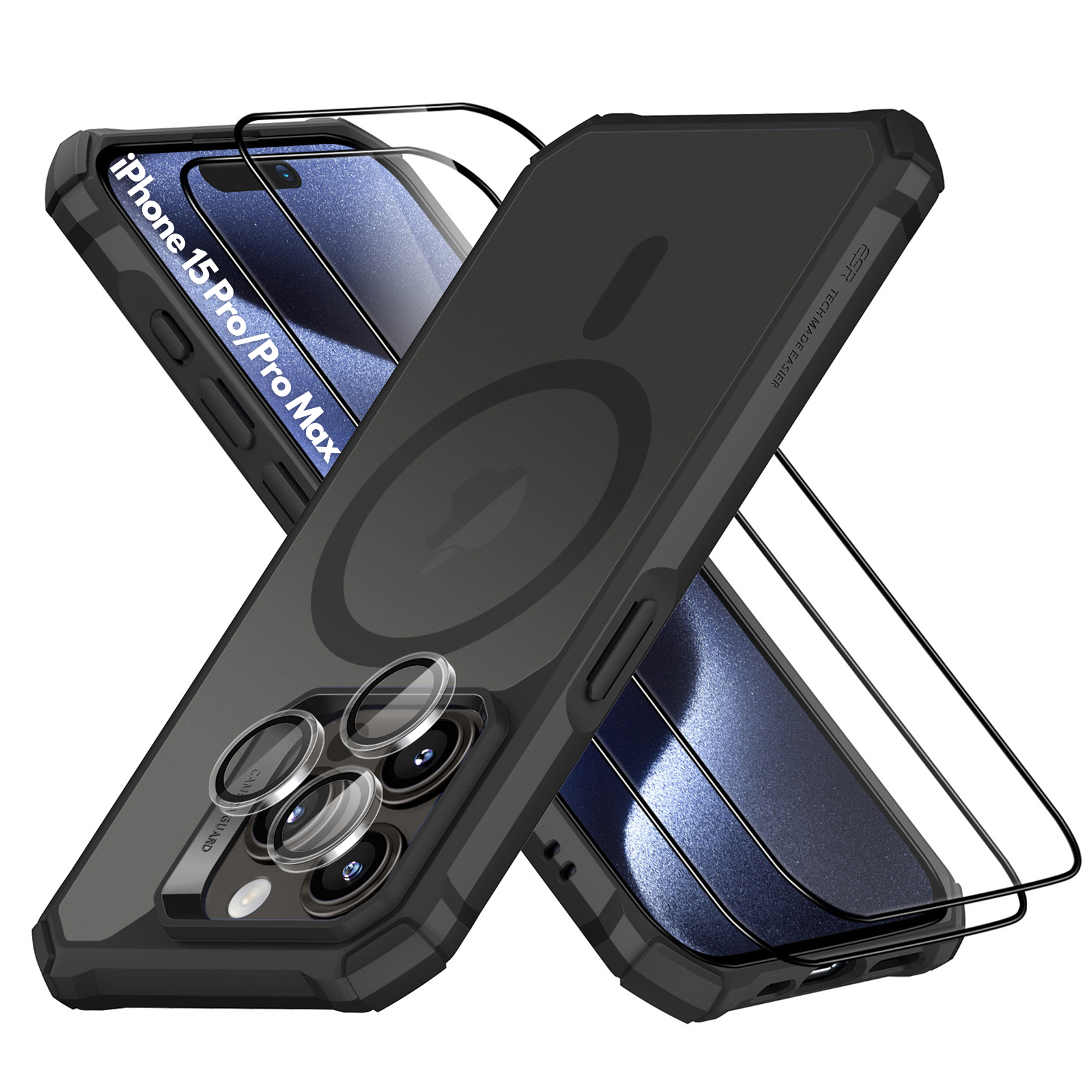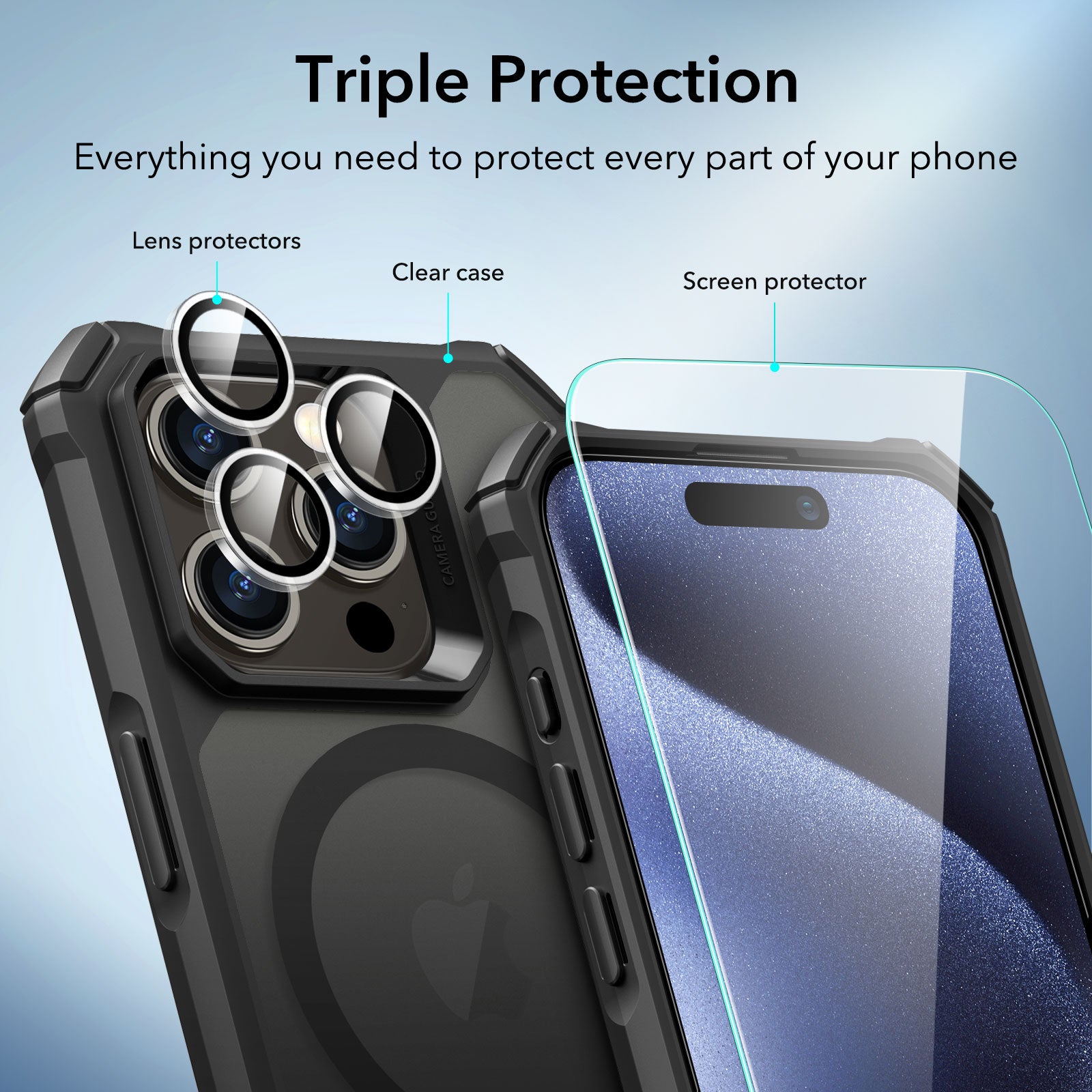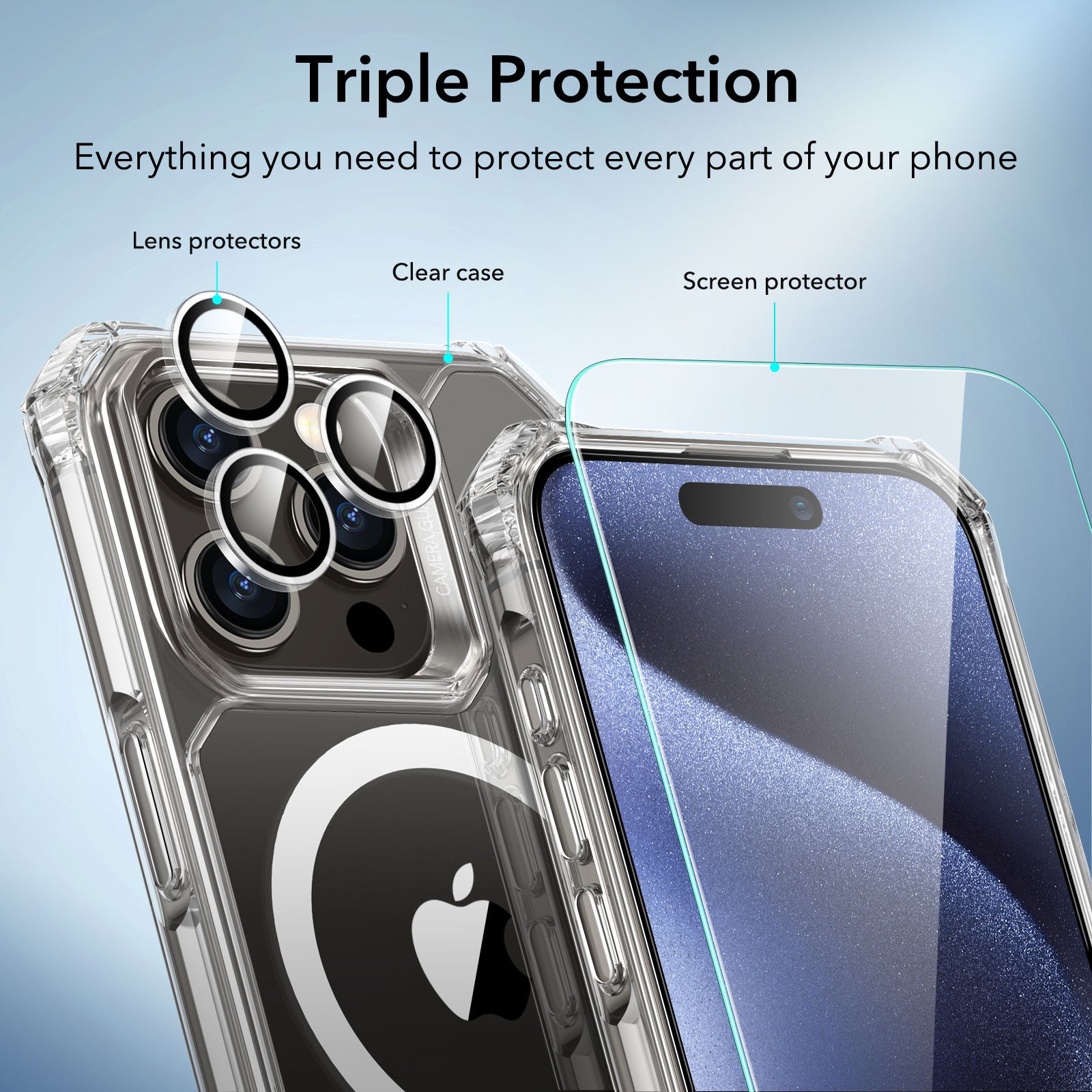This set includes ESR Air Armor MagSafe Cover, 2 x Screen Protectors & 1 x Individual Camera Lens Protectors for iPhone 15 Pro/15 Pro Max.