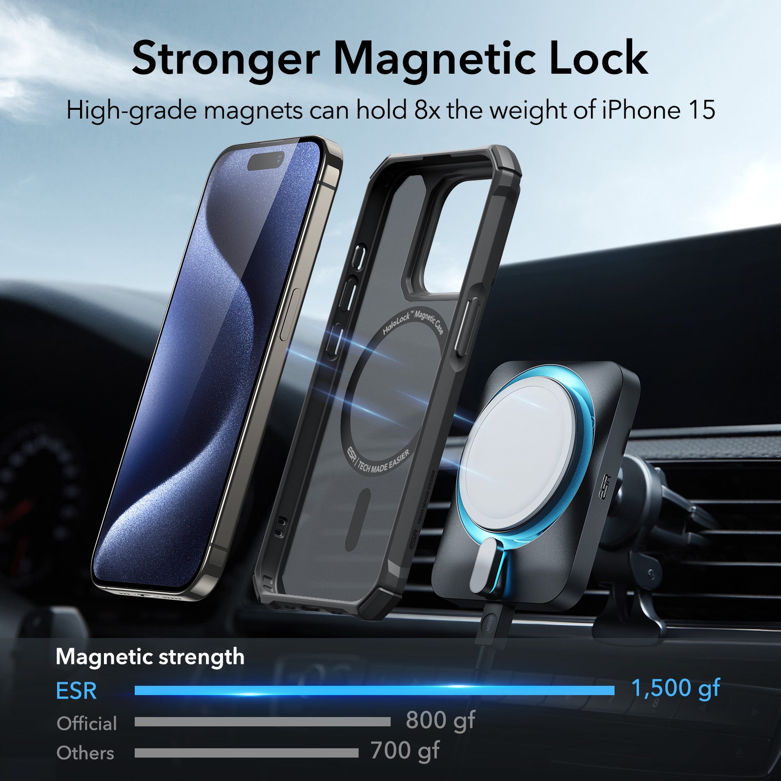 Strong Magnetic Lock: The strong built-in magnets offer a holding force of 1,500 g, ensuring that your phone stays firmly in place when attached to MagSafe accessories. This robust magnetic lock provides peace of mind, whether you're using a MagSafe charger, car mount, or wallet. You can trust that your iPhone 15 Pro / 15 Pro Max will remain secure, even during movement or impact.