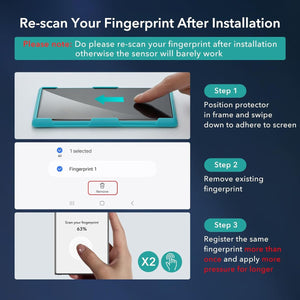Each Set Includes 2 x Tempered Glass Screen Protectors and 1 x Individual Camera Lens Protectors for the Samsung Galaxy S24 Ultra. After installation, please delete old fingerprint and reconfigure a new one in order for the fingerprint sensor to work properly and to ensure continued security and accessibility with every touch.