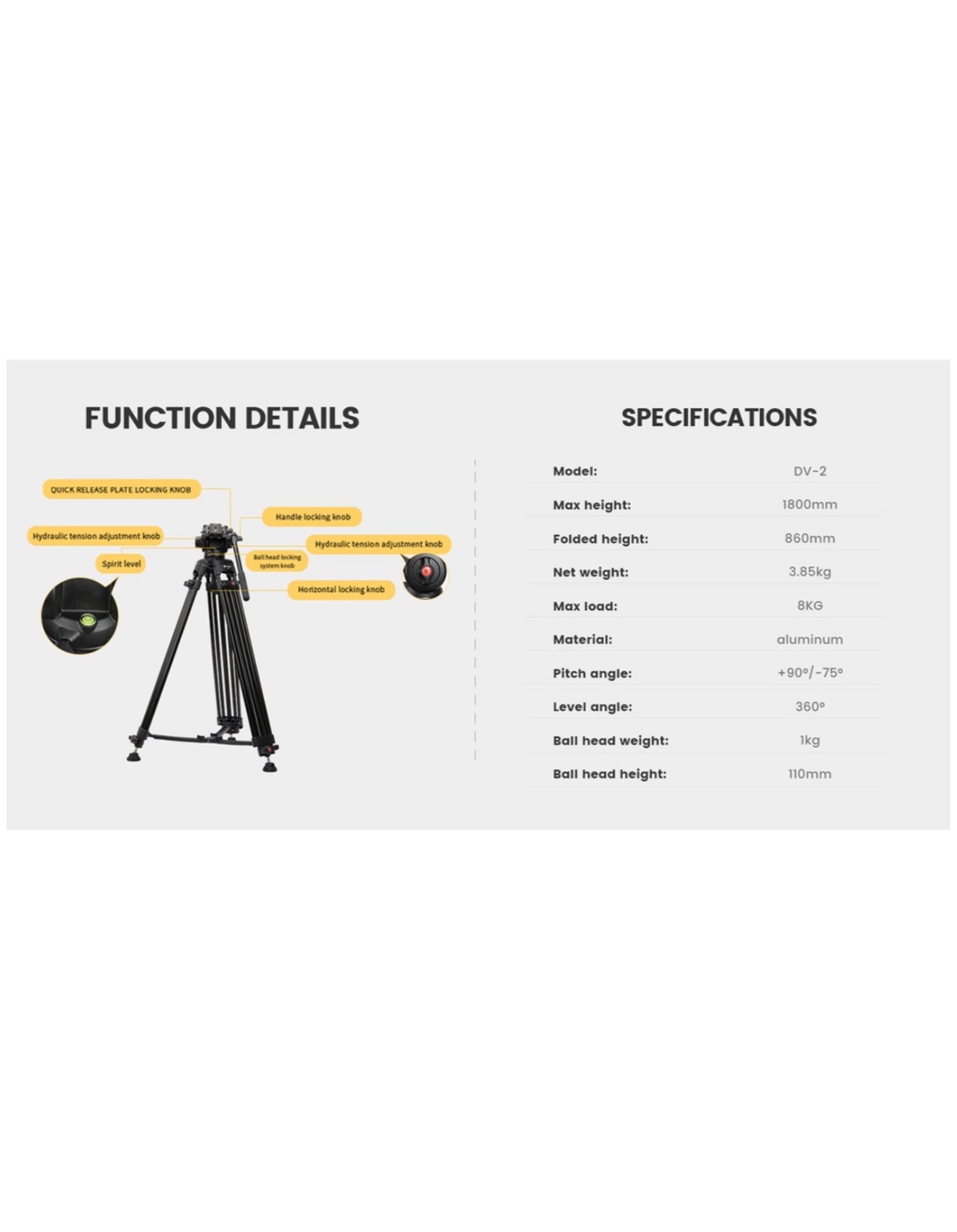 Motion Balance System for Effortless Tilt Control: The DV-2's Tripod Stand advanced motion balance system allows you to adjust tilt resistance according to your camera setup weight. This ensures constant control regardless of tilt degree-making camera operation smoother, easier, and less fatiguing over long shoots.
