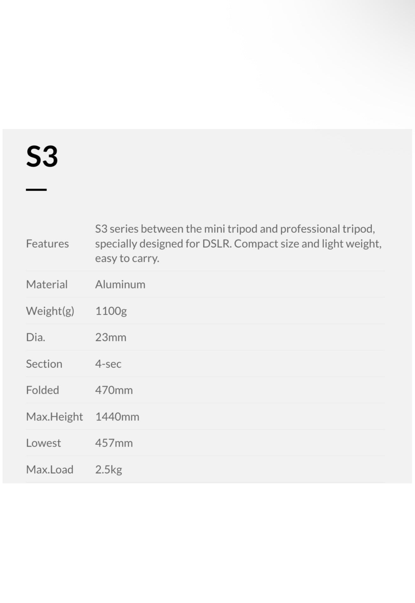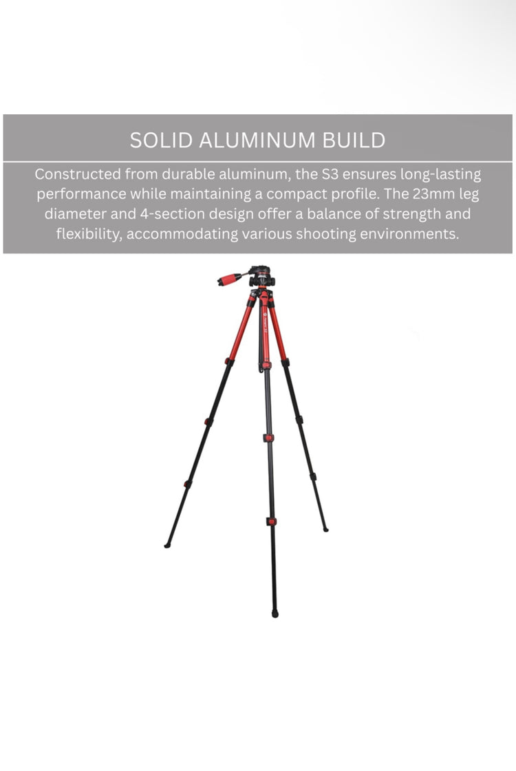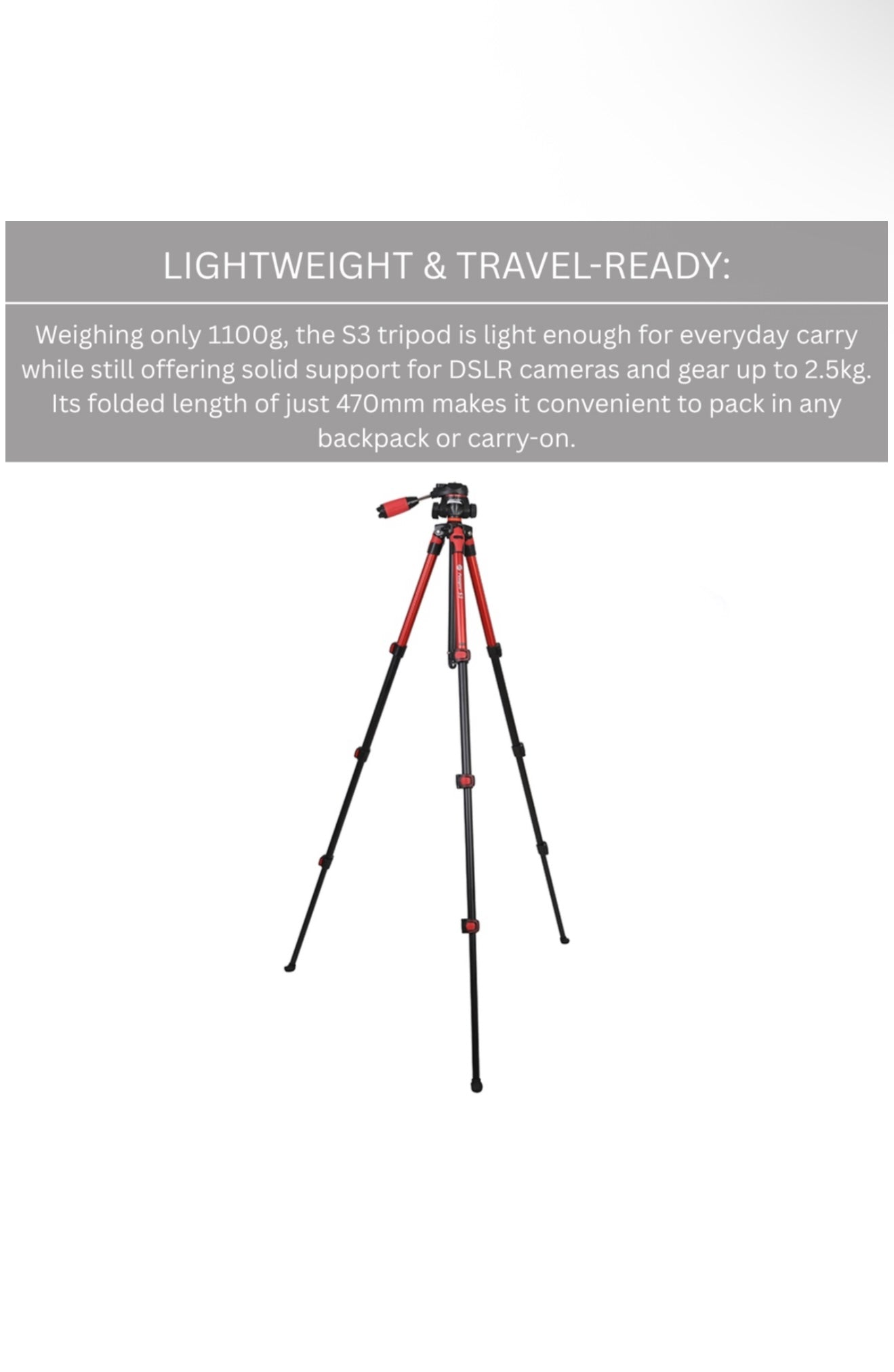 Whether you're capturing everyday moments or exploring scenic landscapes, the S3 Series Tripod offers lightweight reliability in a compact, DSLR-friendly package.