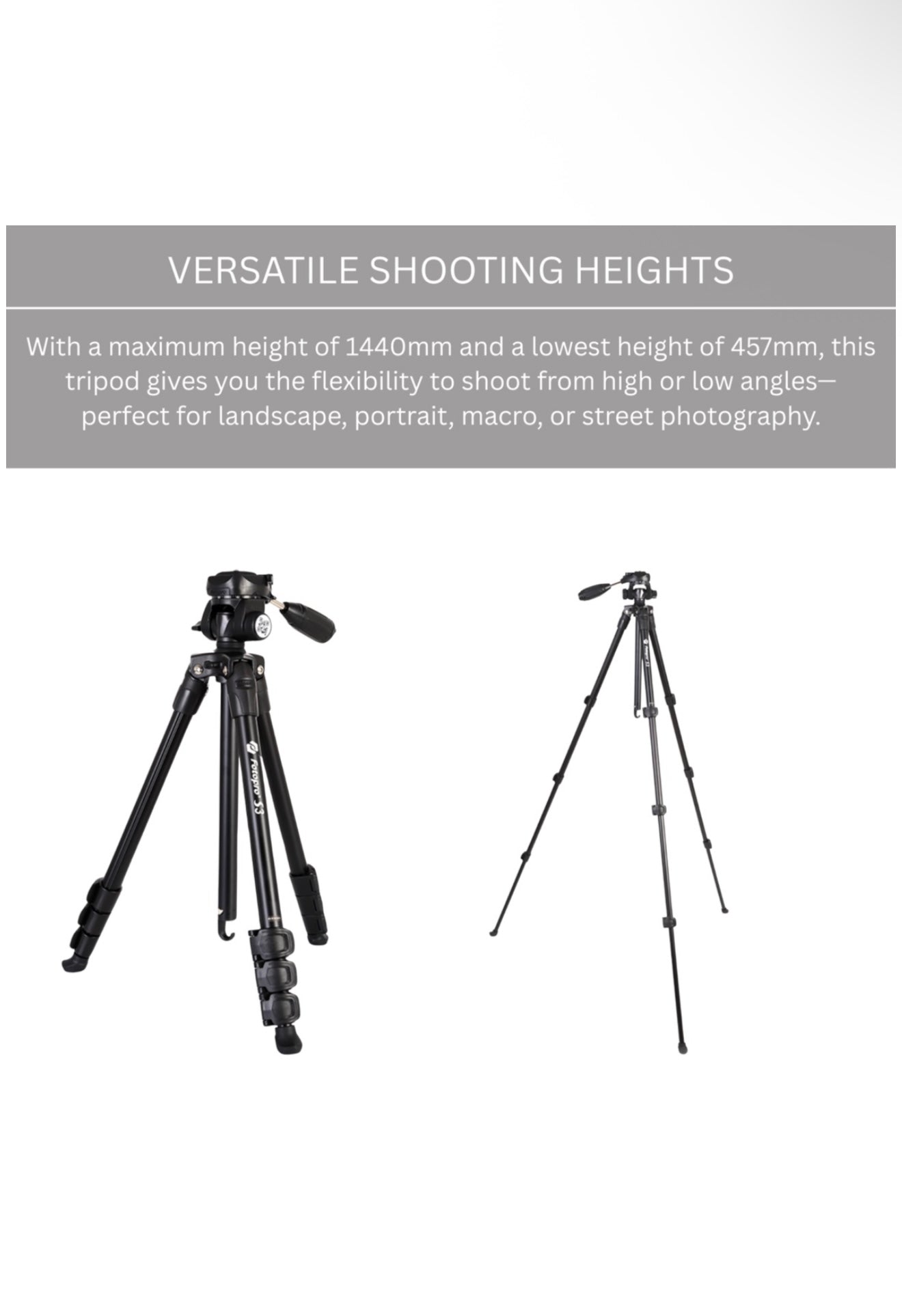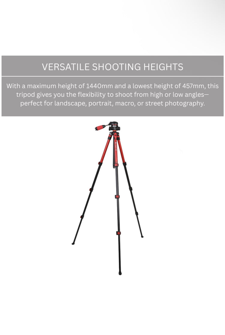 With a maximum height of 1440mm and a lowest height of 457mm, this tripod gives you the flexibility to shoot from high or low angles-perfect for landscape, portrait, macro, or street photography.