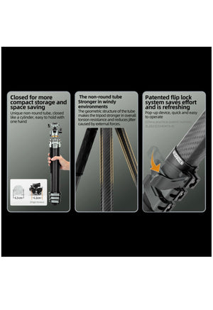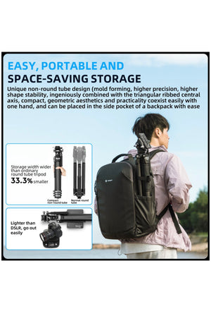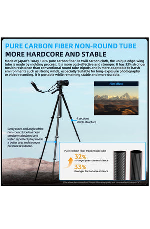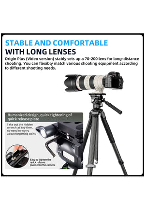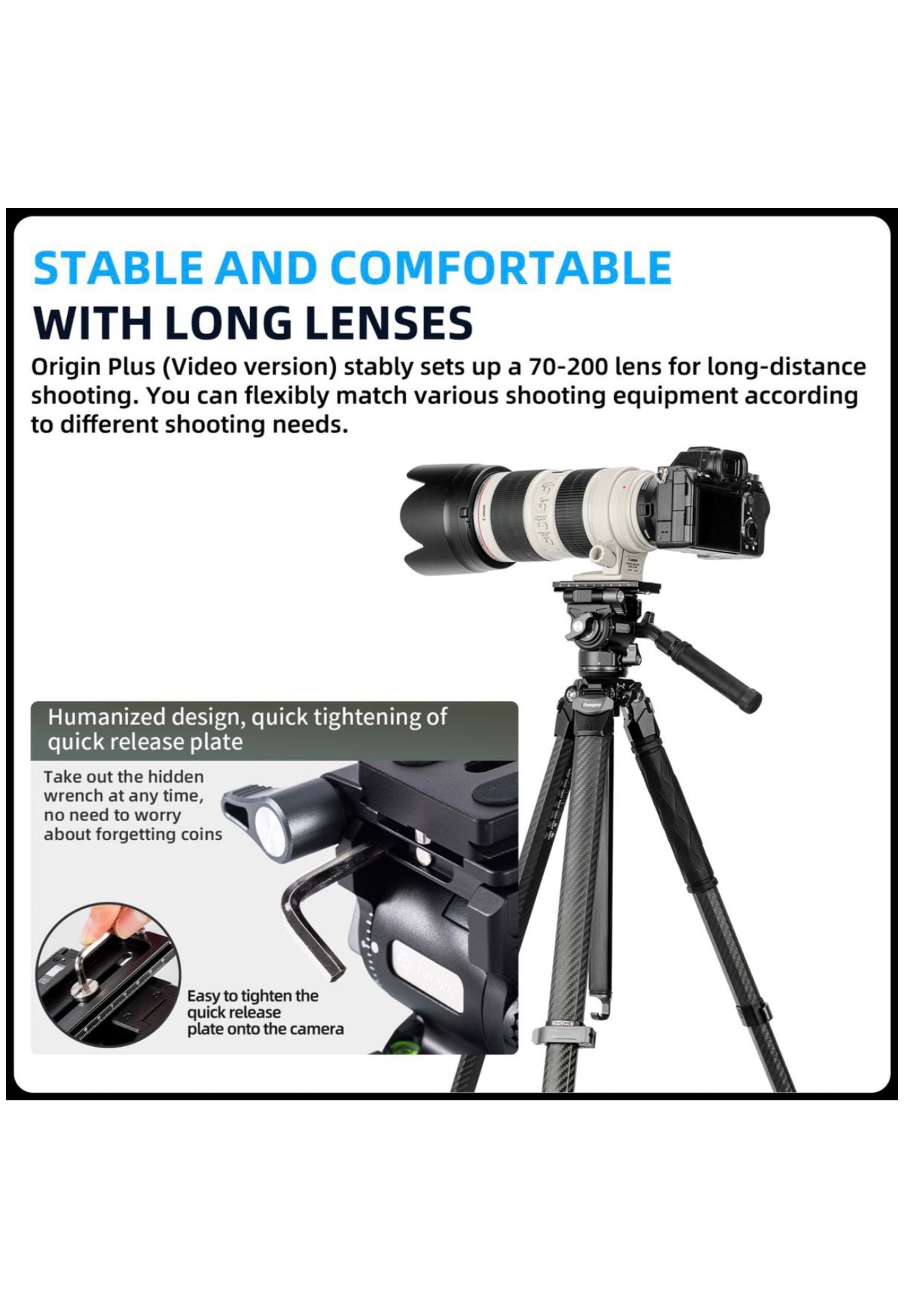 Lightweight Yet Ultra-Stable: Weighing only 1.66kg (3.66 lbs), the Origin Plus tripod video camera tripod stand is lighter than many DSLR setups yet supports up to 5kg (11.02 lbs)-perfect for professional cameras, long lenses, and video rigs. The non-round carbon fiber tubes, precision-molded for strength, enhance rigidity while keeping weight low, making it an ideal companion for travel and location shoots.