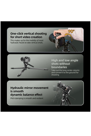 Smooth Hydraulic Fluid Head: Equipped with the MH-6A Pro heavy-duty fluid head, the portable tripod stand delivers buttery-smooth tilts and pans with a dynamic balance system that adapts to your camera's weight. Whether shooting horizontally or vertically, the one-click vertical shooting function allows effortless switching for short-form content creation.